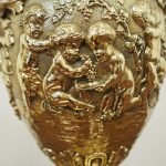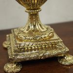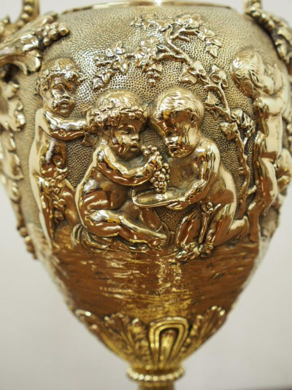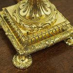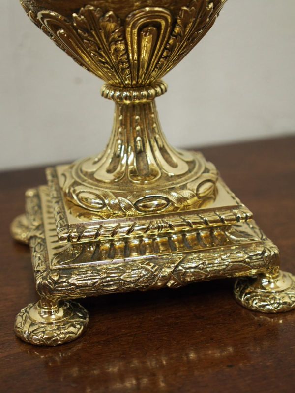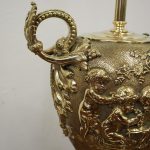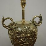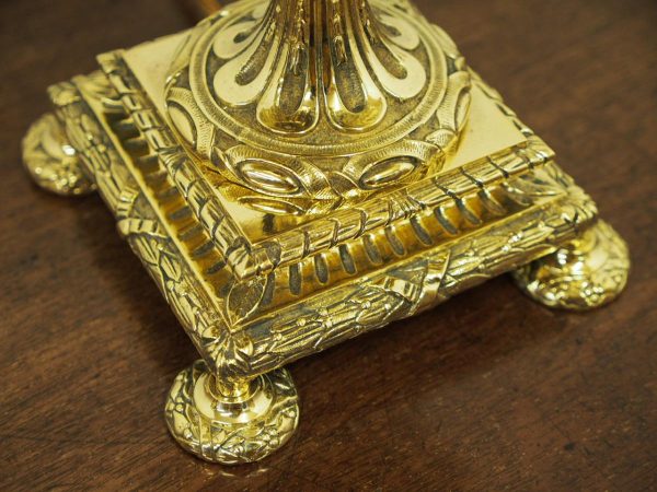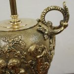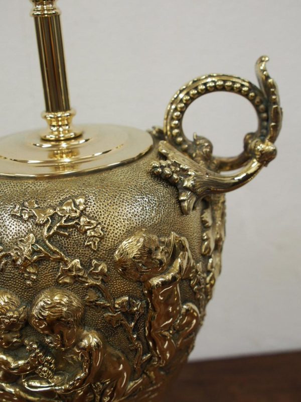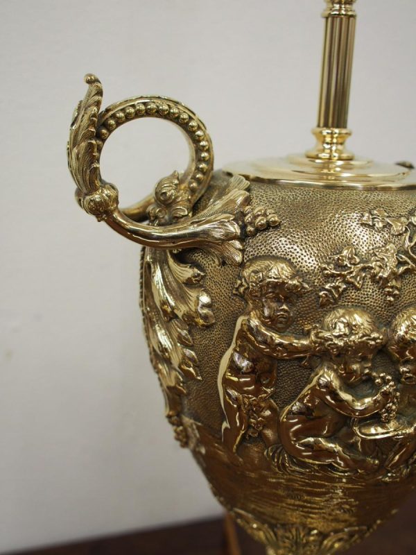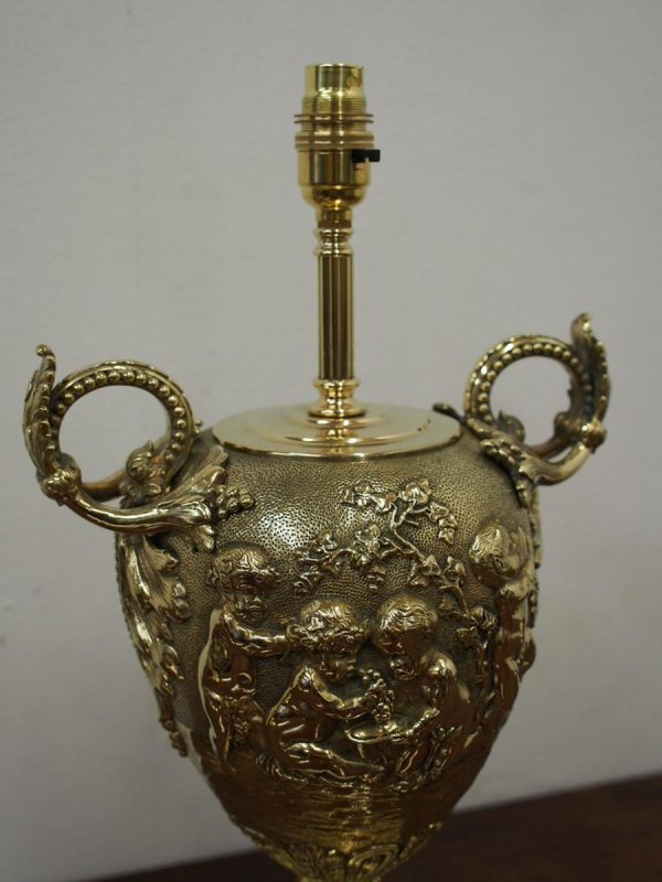 Circa 1860, Victorian cast brass oil lamp (converted for electricity). The fluted columns holds the lamp in place, with an urn that has rococo lifting handles decorated with swags, acanthus leaves and flowers. To the front and back of the cast body are cherubs and fawns, with the rectangular, raised base decorated with casting and finishing on cast brass feet with a stylish pattern.