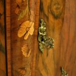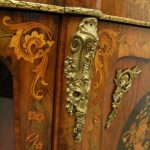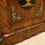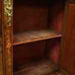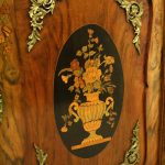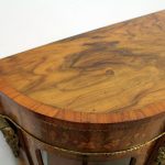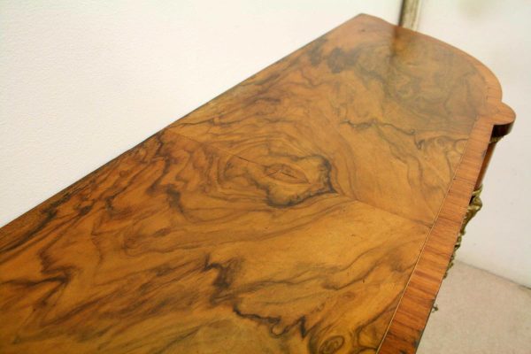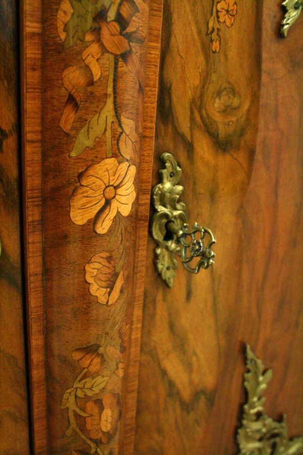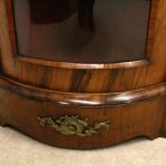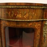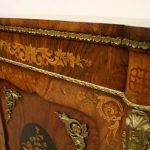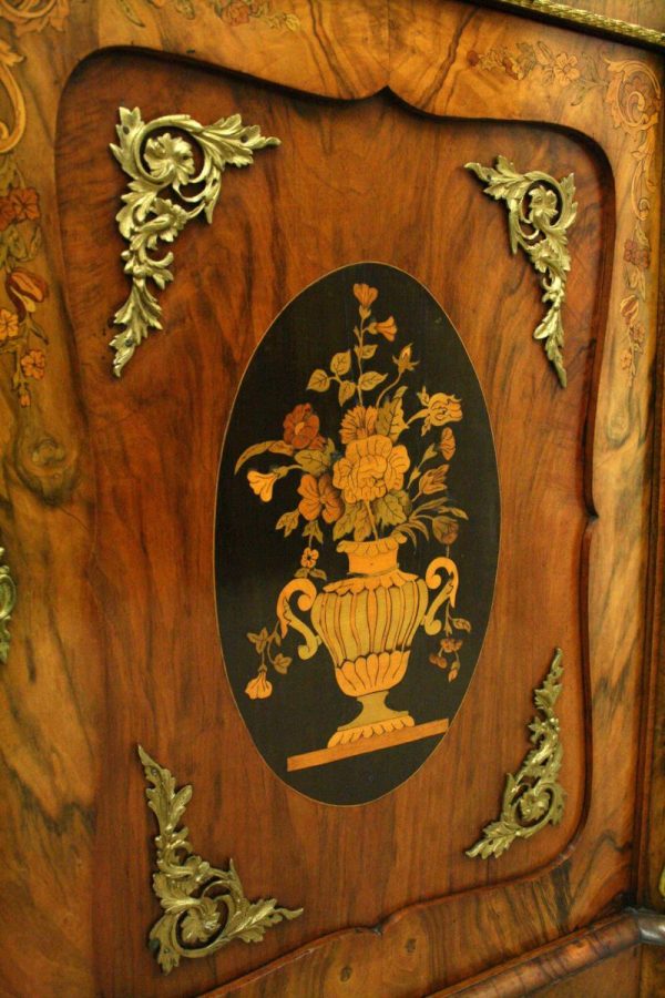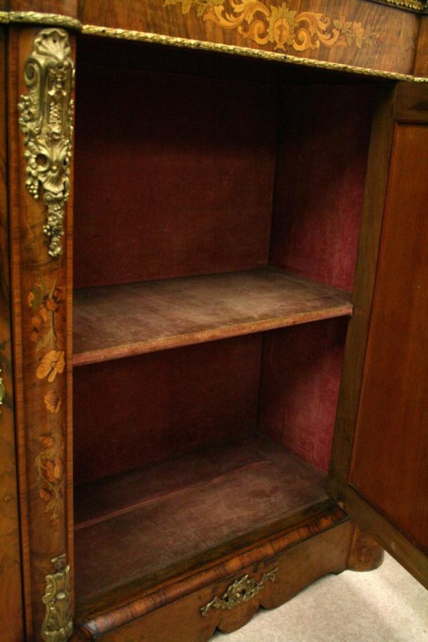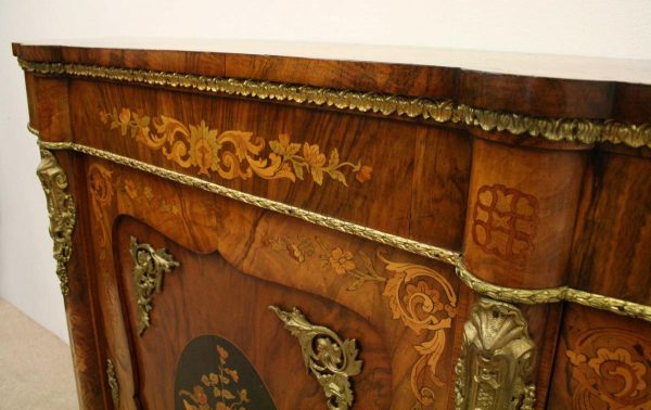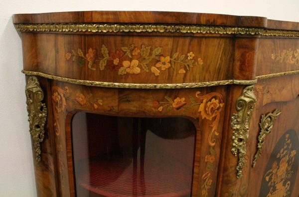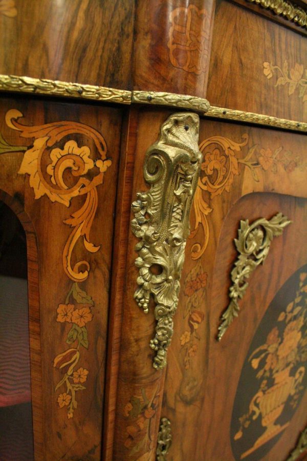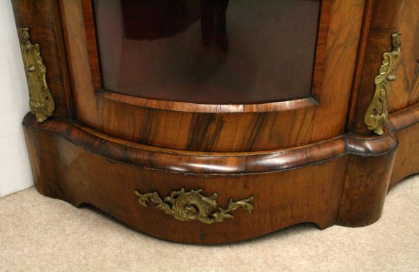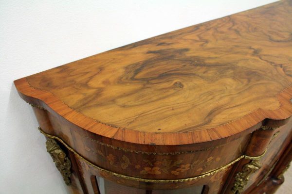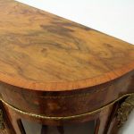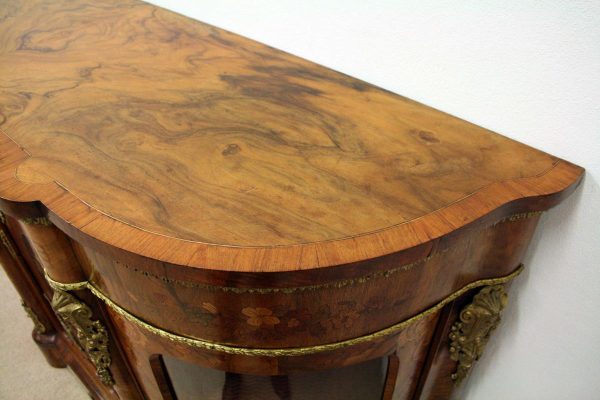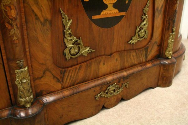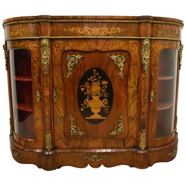 Circa 1870, Victorian figured walnut credenza, the shaped top with tulipwood crossbanding, over an inlaid central door and glazed bowfronted ends all with elaborate ormolu mounts, standing on an enclosed shaped plinth.
