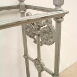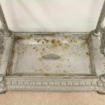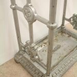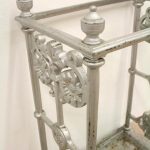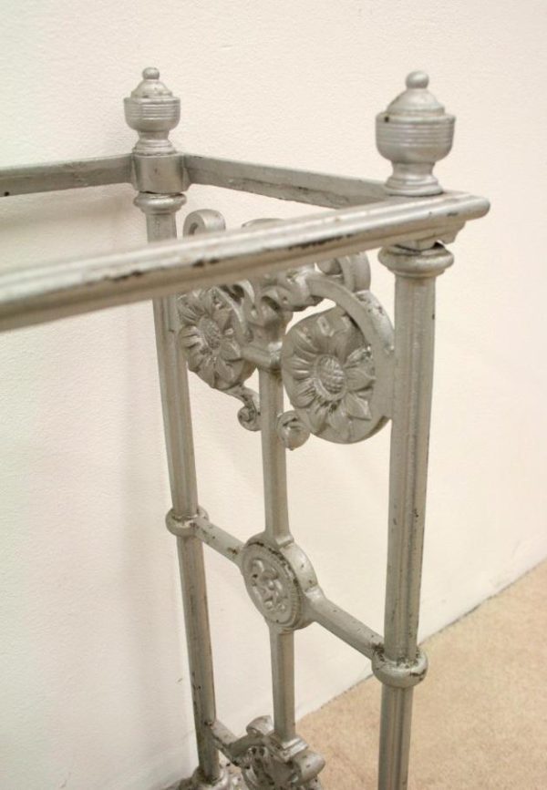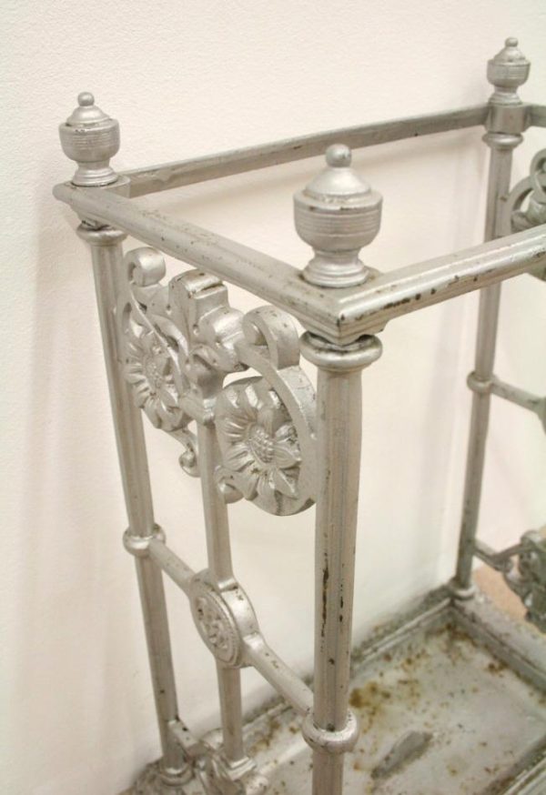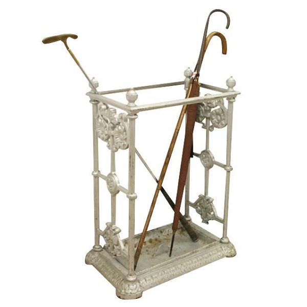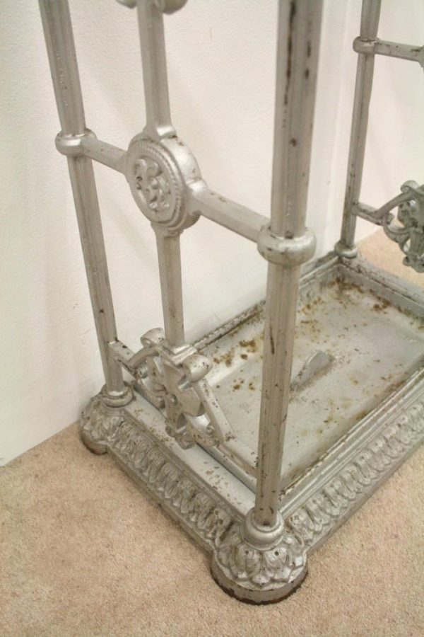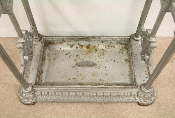 Circa 1870, Victorian cast iron rectangular freestanding stick stand with elaborate open cast floral decorations to sides and original cast iron drip tray contained in a Neo Classical style base.