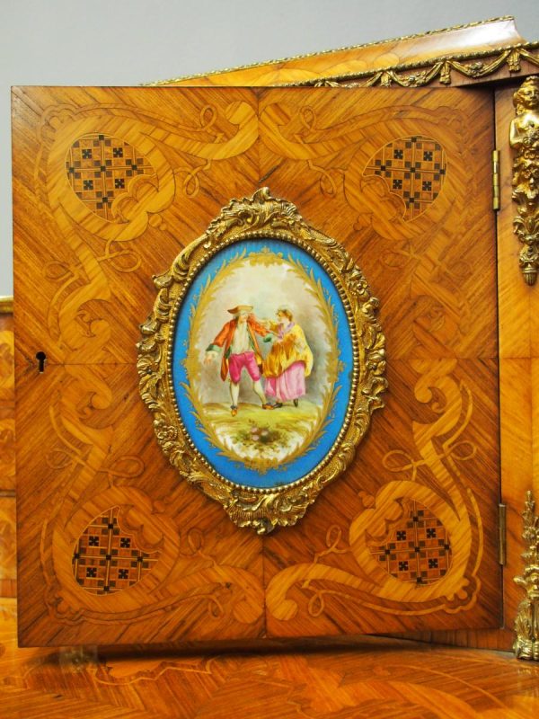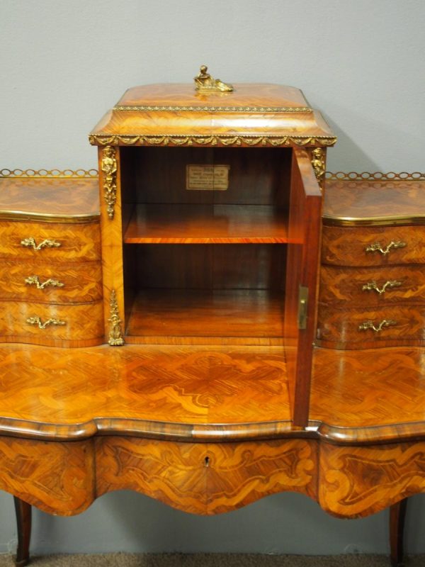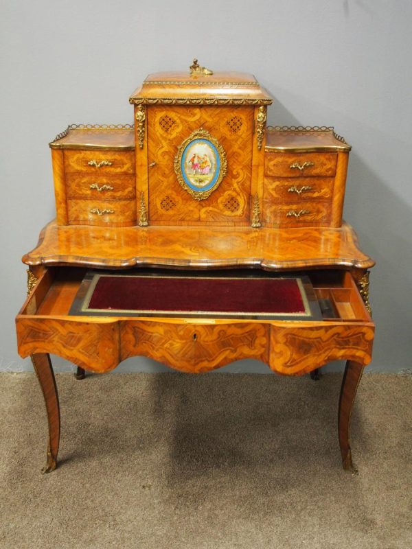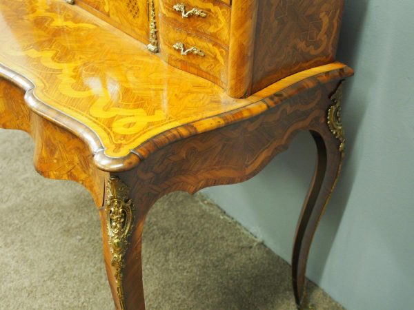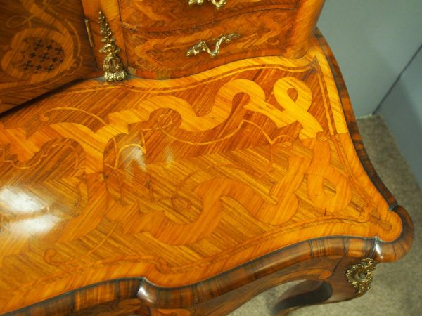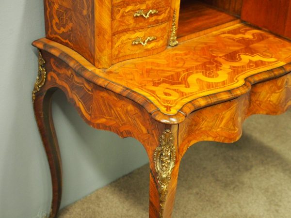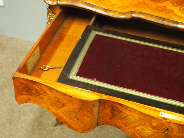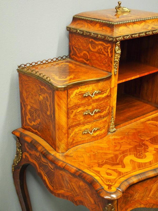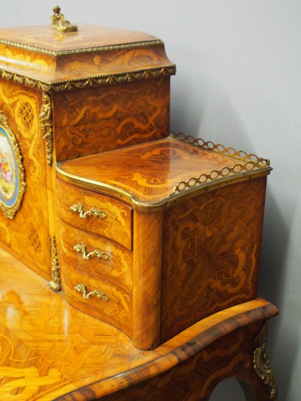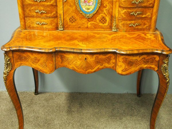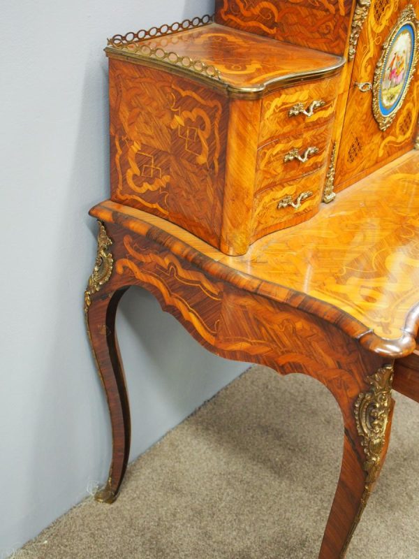 Circa 1870, exhibition quality French Bonheur du jour. With domed top surmounted by gilded figure, and a surrounding fretwork around a combination of fine beaded marquetry and parquetry. The front, central door has a Sevres style panel, and inside is a single shelf and 2 banks of 3 drawers. The top left drawer has a makers label of Robert Strahan and Company, Dublin. Beneath this is a single drawer with writing slope and sections for stationery, and a cross-banded kingwood fore-edge. It all stands on tall cabriole legs with gilt mounts and finishing on cast sabots. Polished to all sides (freestanding).