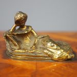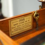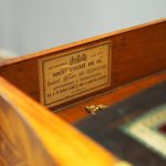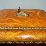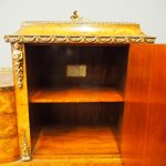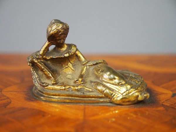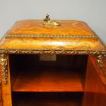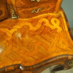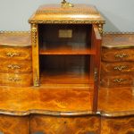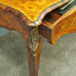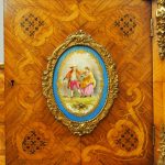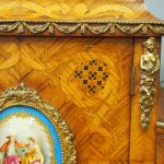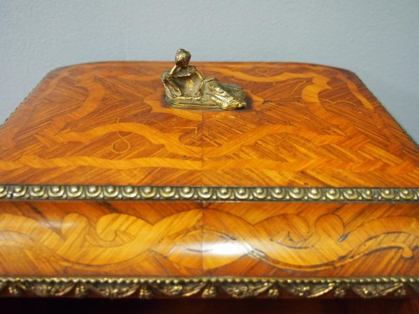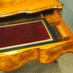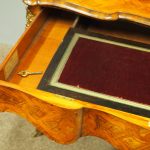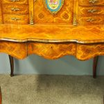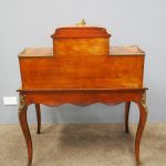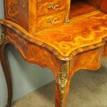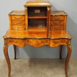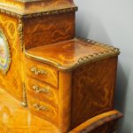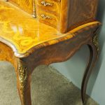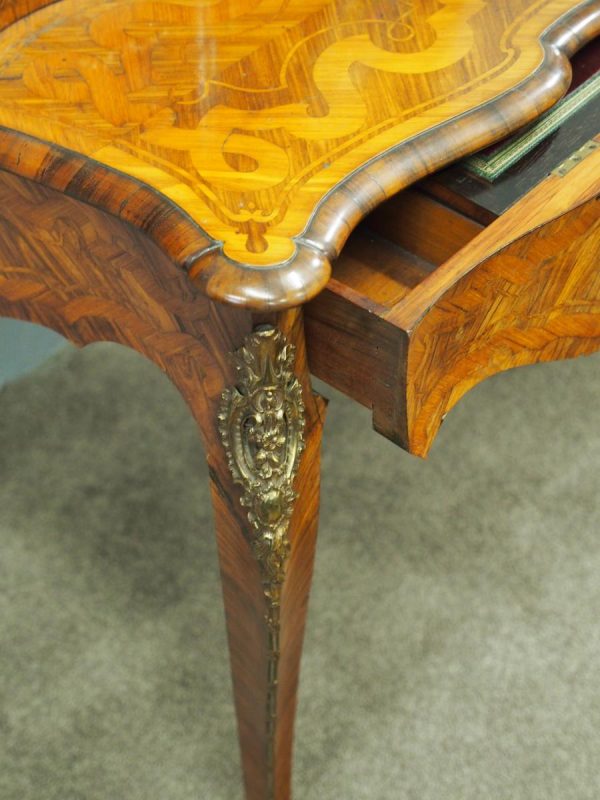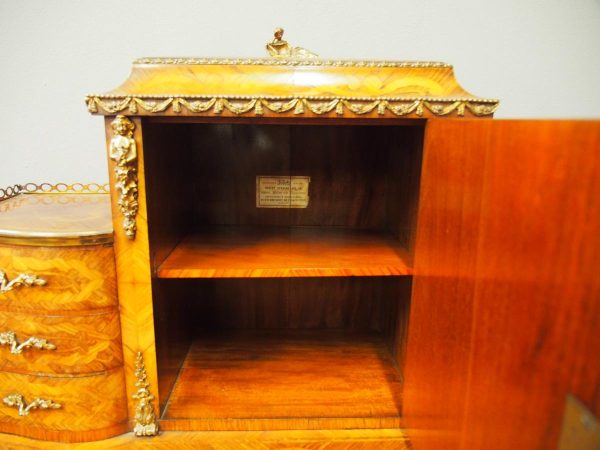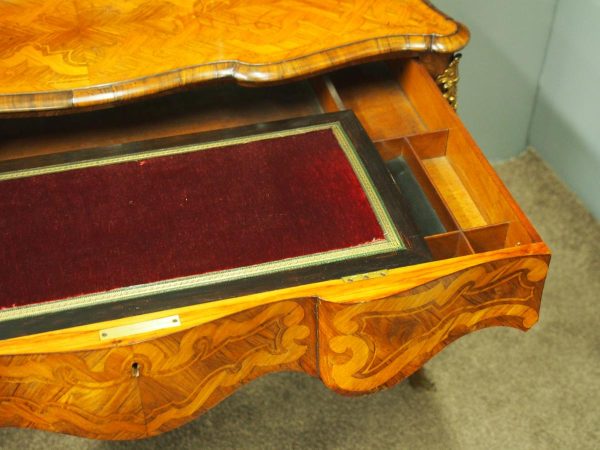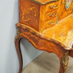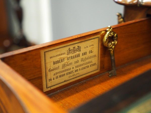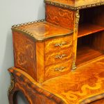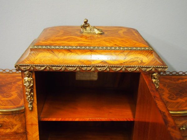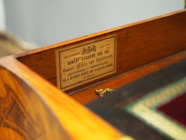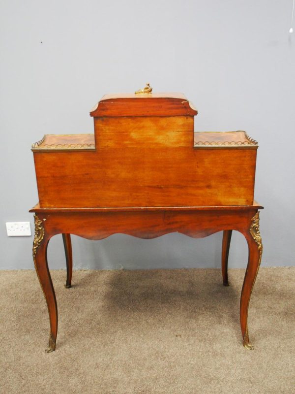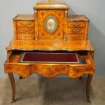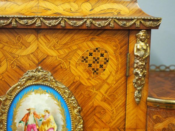 Circa 1870, exhibition quality French Bonheur du jour. With domed top surmounted by gilded figure, and a surrounding fretwork around a combination of fine beaded marquetry and parquetry. The front, central door has a Sevres style panel, and inside is a single shelf and 2 banks of 3 drawers. The top left drawer has a makers label of Robert Strahan and Company, Dublin. Beneath this is a single drawer with writing slope and sections for stationery, and a cross-banded kingwood fore-edge. It all stands on tall cabriole legs with gilt mounts and finishing on cast sabots. Polished to all sides (freestanding).