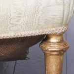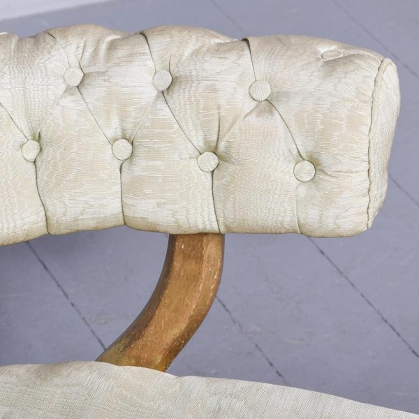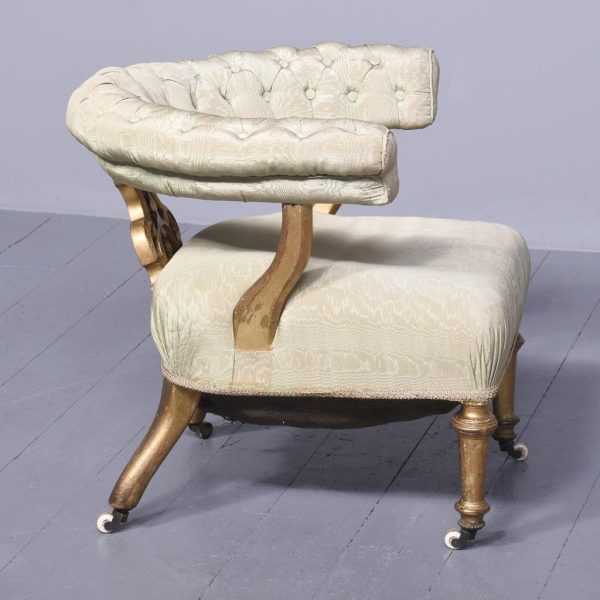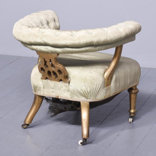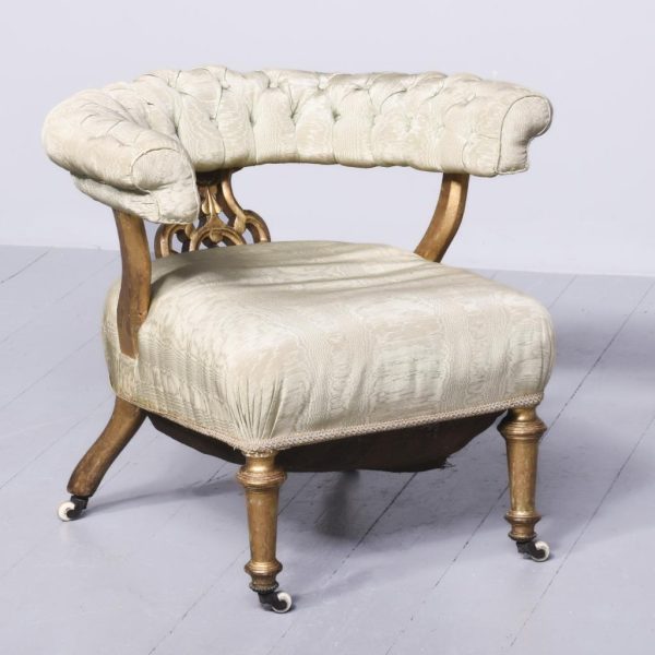 Circa 1860. A mid Victorian upholstered and giltwood framed horseshoe shaped chair. The shaped rail, which is tufted with pleating and deep buttoning in an ochre silk. The back is supported by two shaped uprights and a pierced back with foliate carving, with a large stuffover seat, back legs are turned and slightly out swept, front legs are turned, ring turned ad tapering finishing with a brass collar and white porcelain castors.