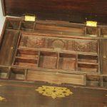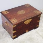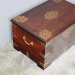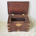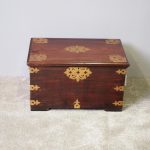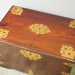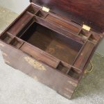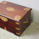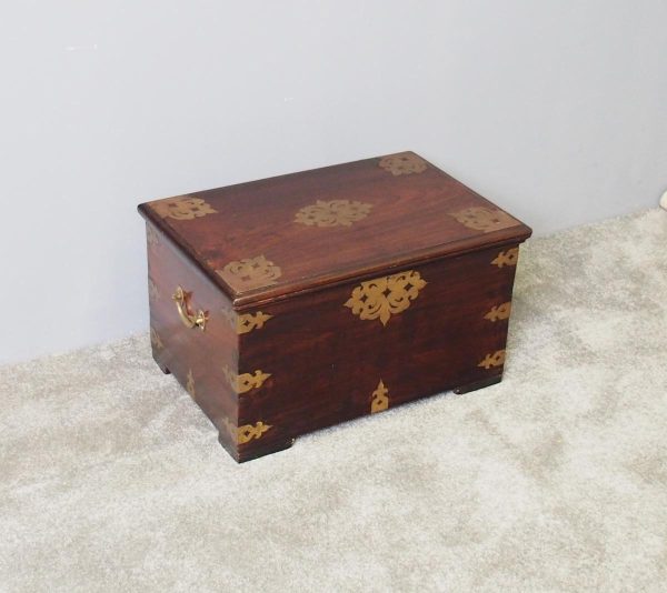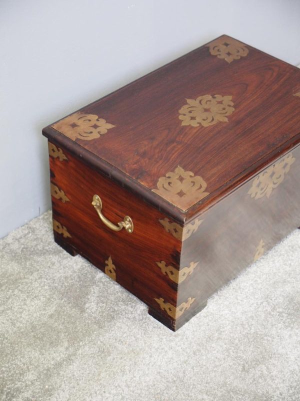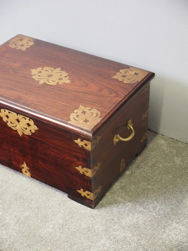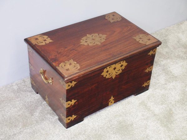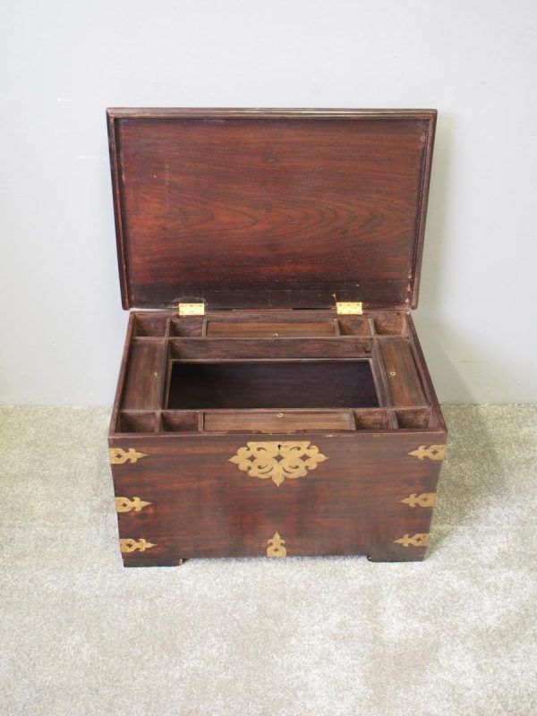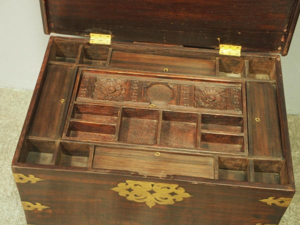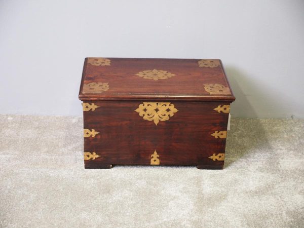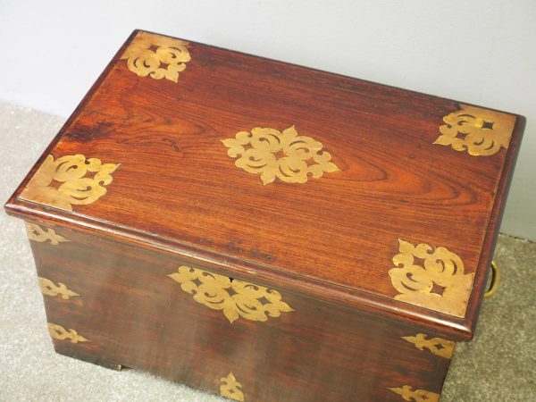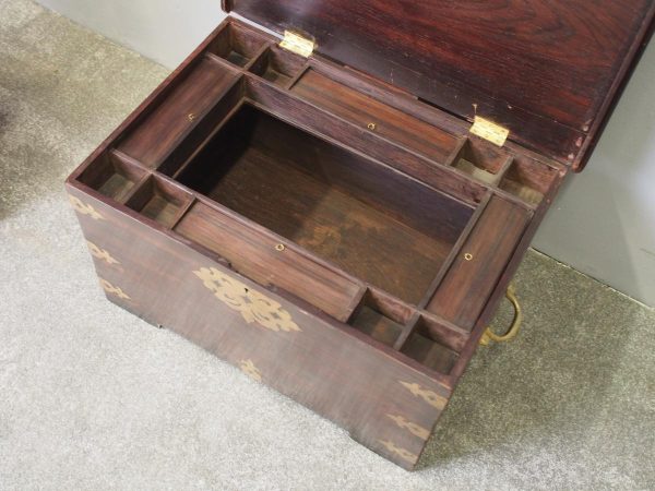 Circa 1850, rare Victorian Indian Rosewood brass mounted, fitted trunk in the colonial style. The rectangular top with extensive foliate brass inlay and moulded rim opens to a finely fitted, removable interior with carved lids and wells. The military-type, cast brass carrying handles are to the brass mounted and banded body.