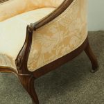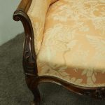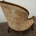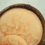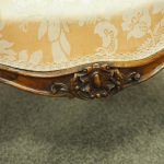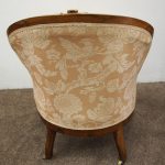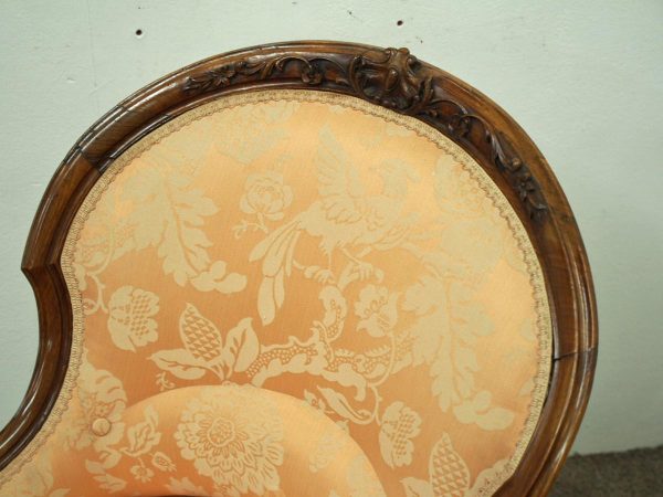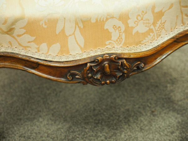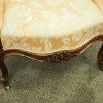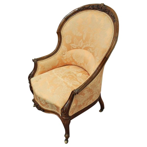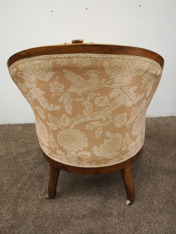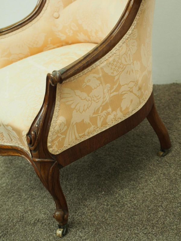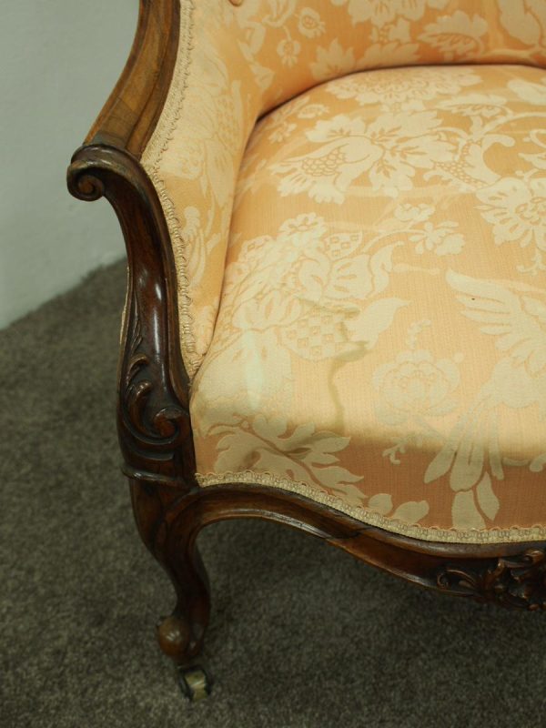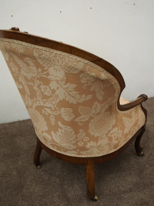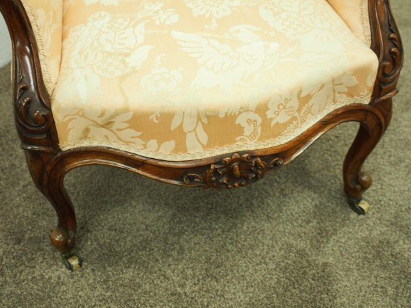 Circa 1870, small well carved Victorian ladies chair. With balloon shaped back and foliate carving to the walnut frame, leading on to shaped arms with an upholstered seat in pink damask. A deep apron to the front connects to the cabriole front legs on cast brass and wooden castors, and slightly tapering, outswept back legs on brass castors.
