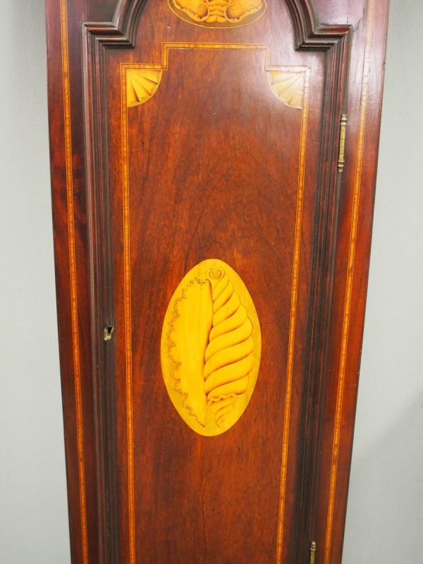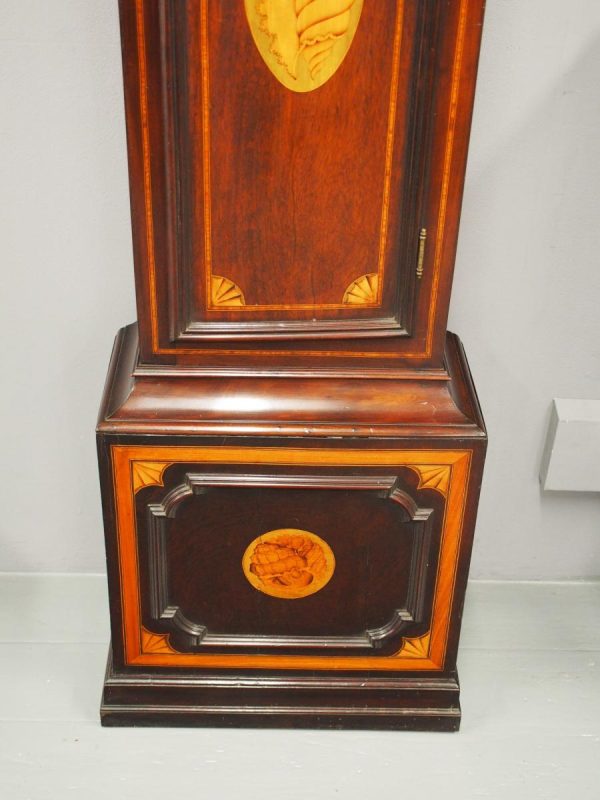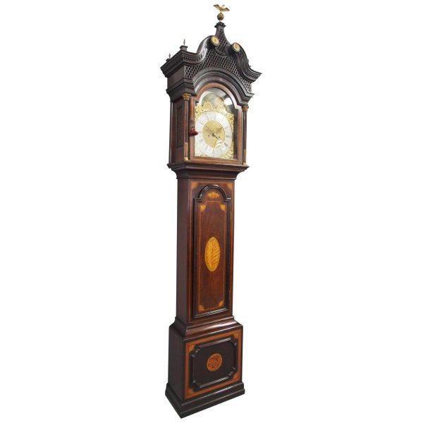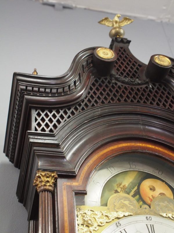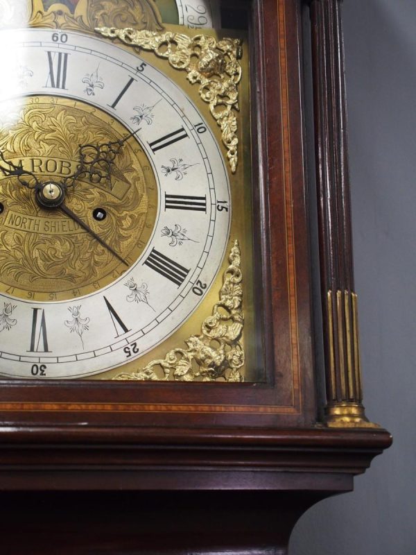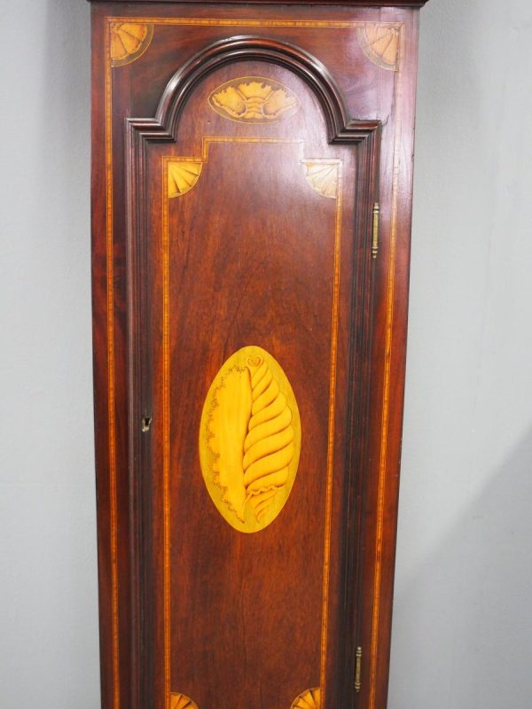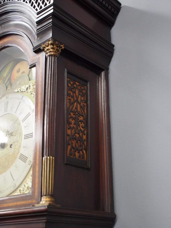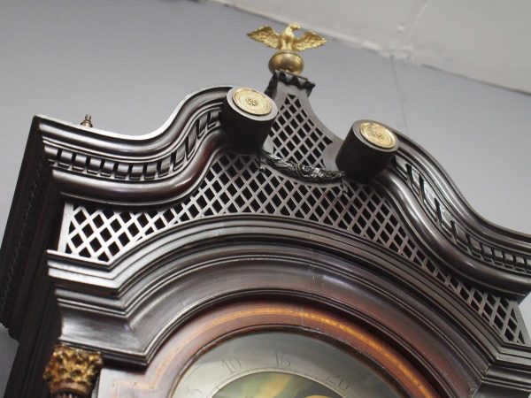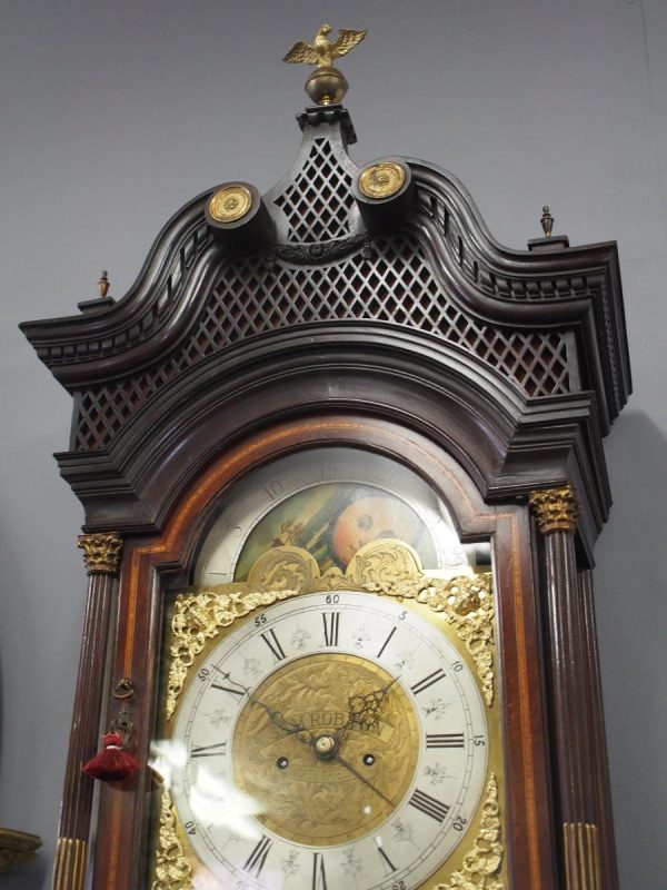 Circa 1850, exhibition quality inlaid mahogany longcase clock by Sam Robson. With stepped hood, topped with a horn top and blind/open fretwork, swags tails, and cast brass circular roundels surmounted by an eagle on a sphere. The Greek key decoration to the top is above a brass and silver dial with a painted moon face. Either side of the door are mahogany and fluted columns with capitals to the top and brass inlay towards the base. The case is profusely inlaid with shells and a fan design, beneath is satinwood banded base on a stepped mahogany plinth.