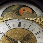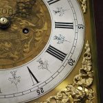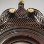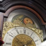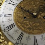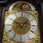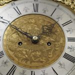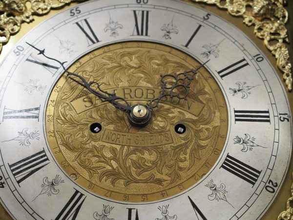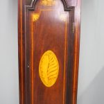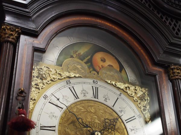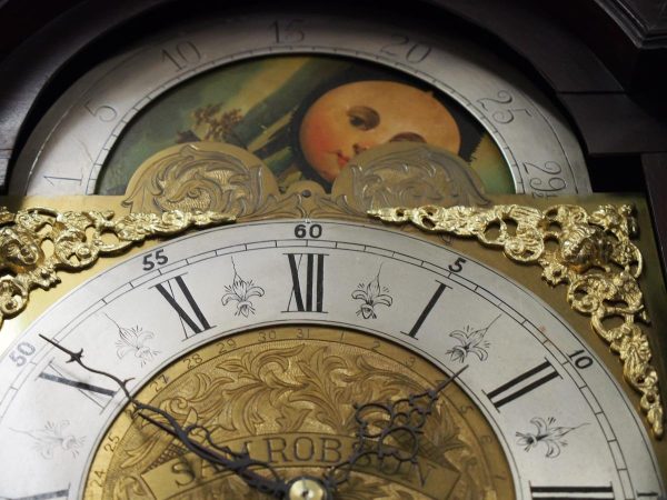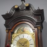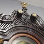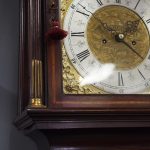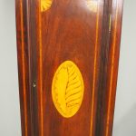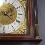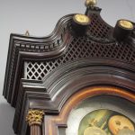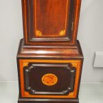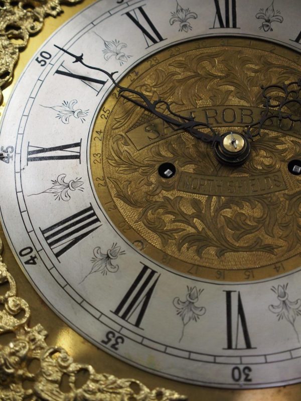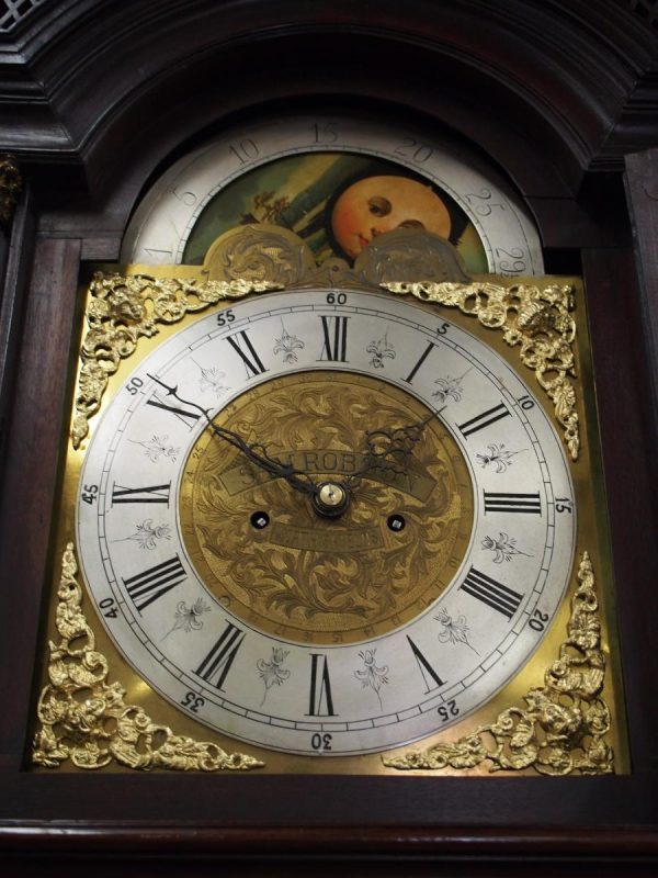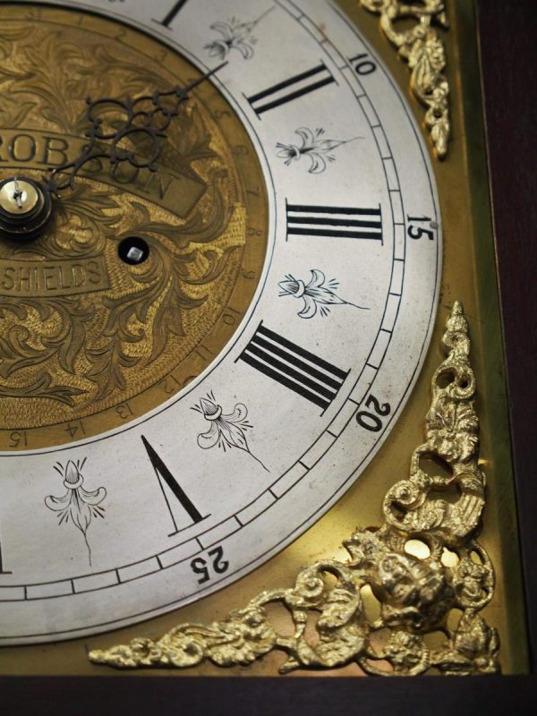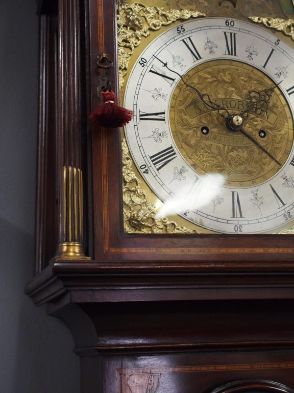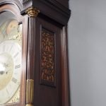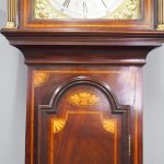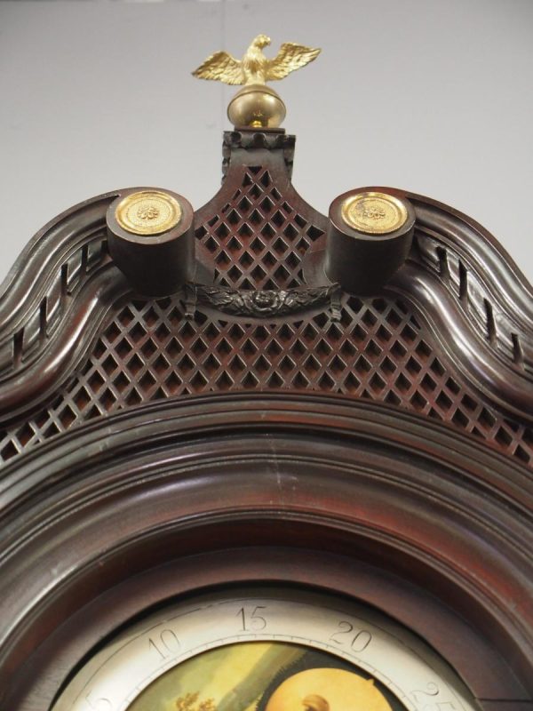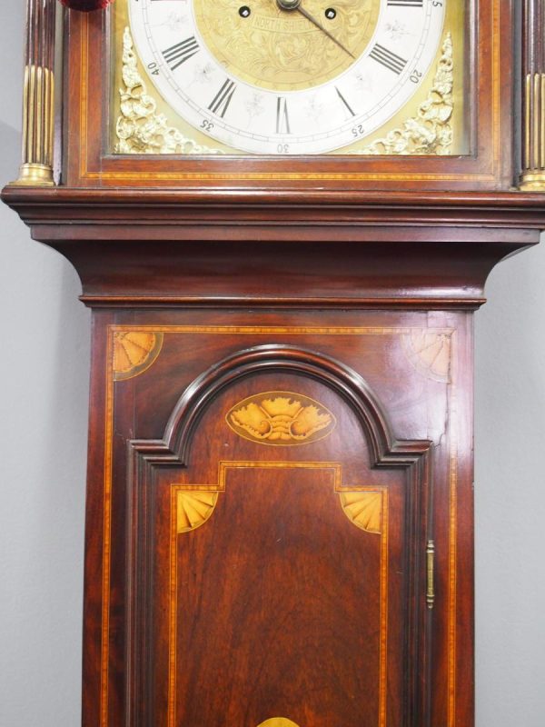 Circa 1850, exhibition quality inlaid mahogany longcase clock by Sam Robson. With stepped hood, topped with a horn top and blind/open fretwork, swags tails, and cast brass circular roundels surmounted by an eagle on a sphere. The Greek key decoration to the top is above a brass and silver dial with a painted moon face. Either side of the door are mahogany and fluted columns with capitals to the top and brass inlay towards the base. The case is profusely inlaid with shells and a fan design, beneath is satinwood banded base on a stepped mahogany plinth.