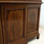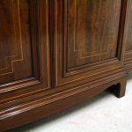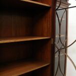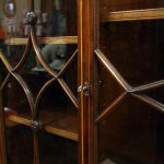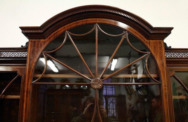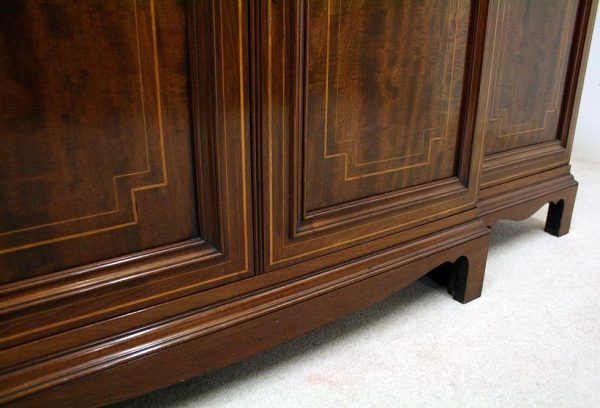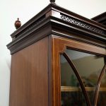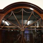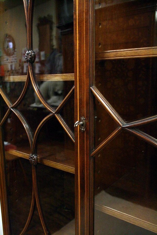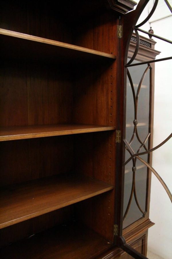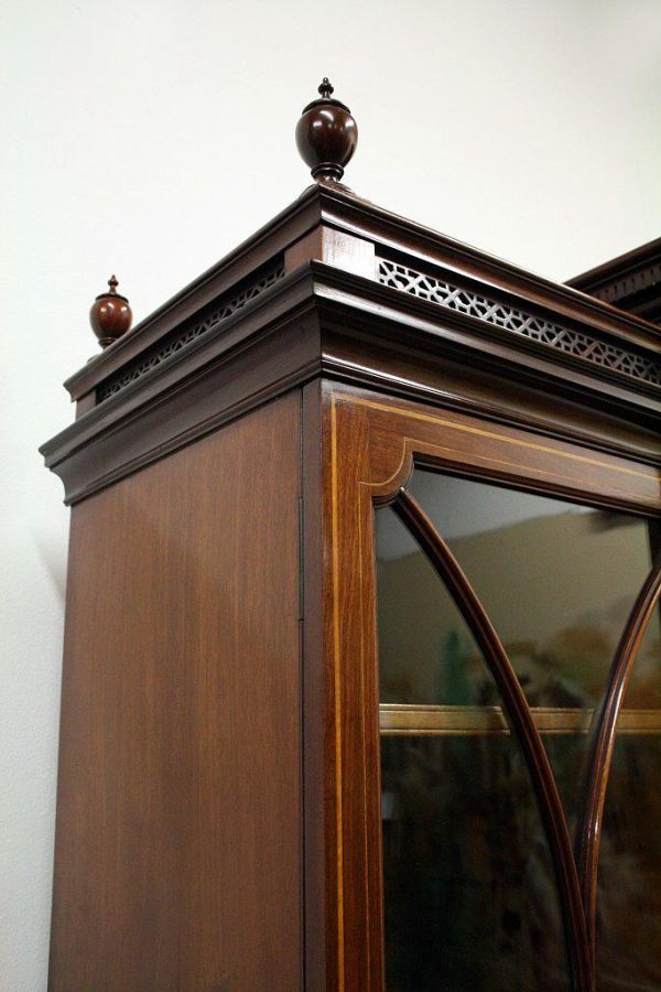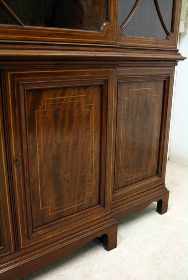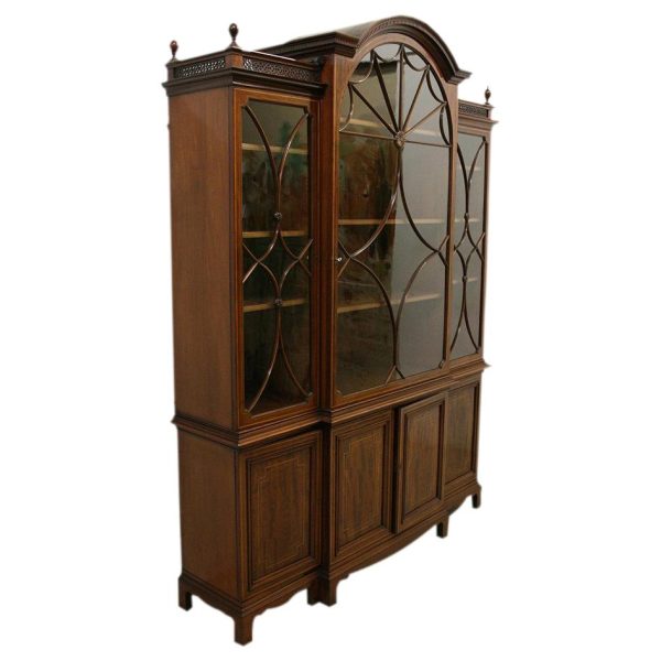 Circa 1880, finest quality mahogany inlaid four door breakfront display cabinet, the dome top with open fretwork and crowned by finials, over very stylish astragal glazed doors, all standing on bracket feet.