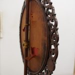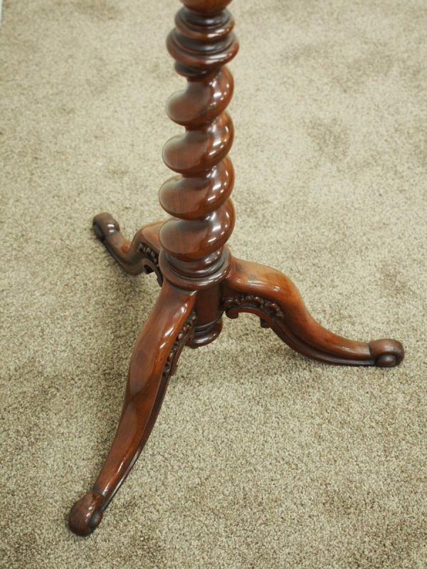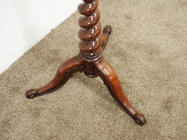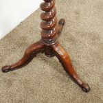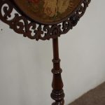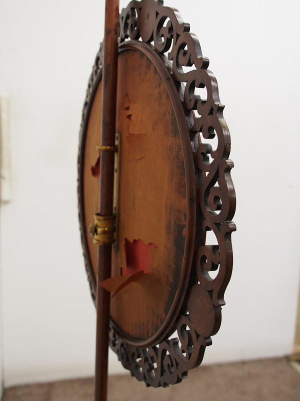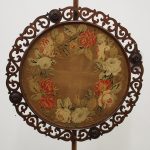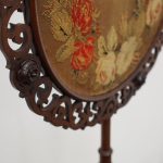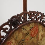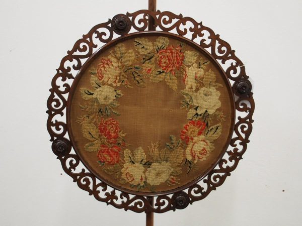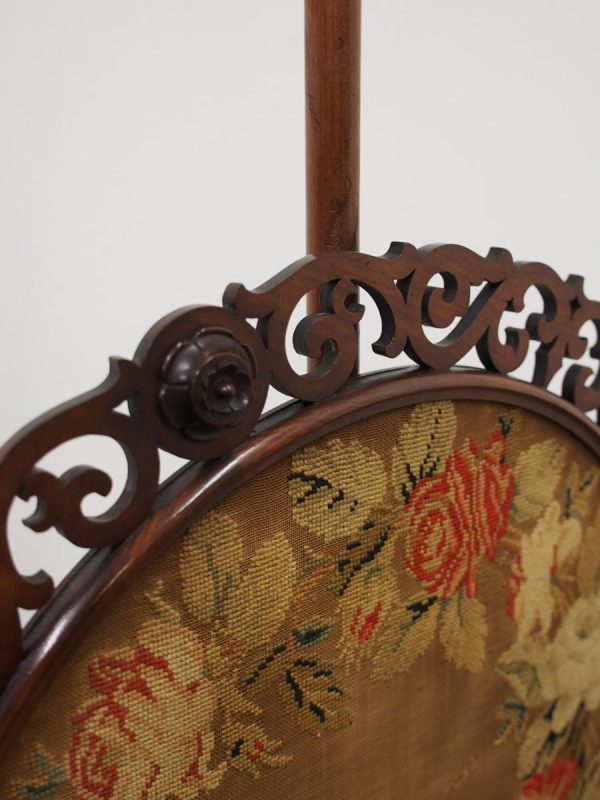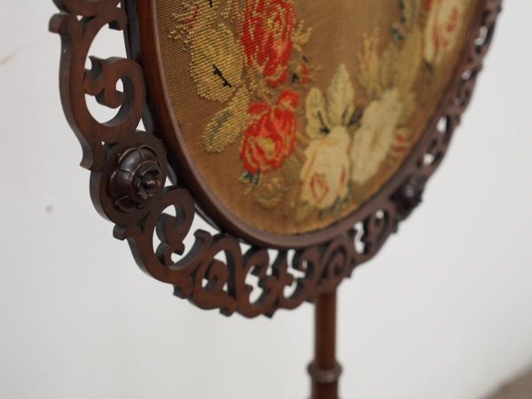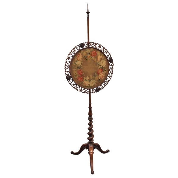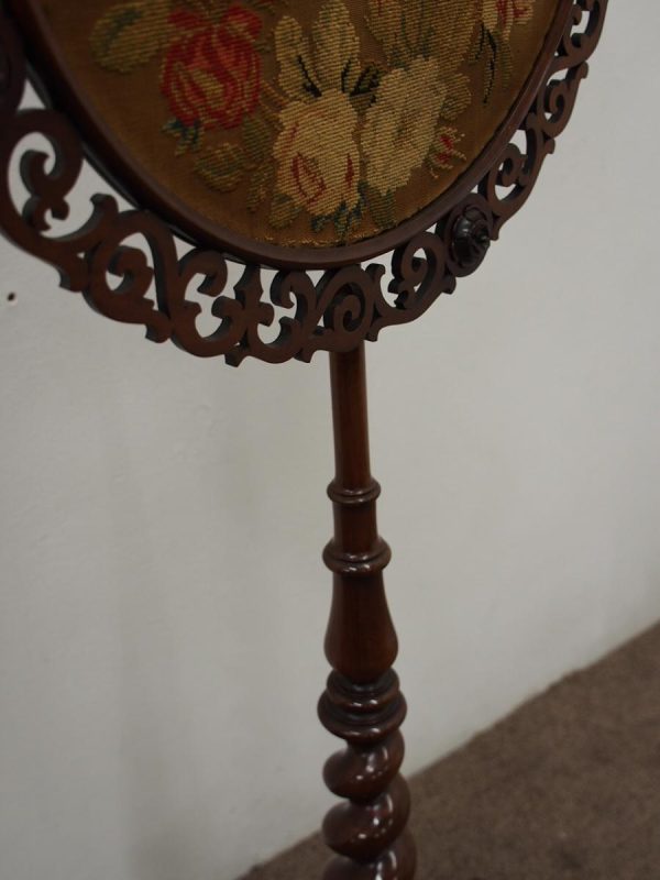 Circa 1850, early Victorian mahogany adjustable pole screen. To the top is a finial on an elongated stem, with a screen featuring a mahogany fretwork frame. Inside the frame is an original gros-point circular tapestry with floral motif and it all leads on to a barley sugar columns which gets broader as it goes downwards. It all stands on 3 carved cabriole legs with C scrolls to the back, are profusely carved and on curling toes.