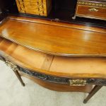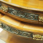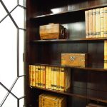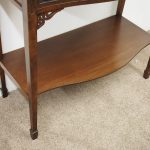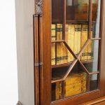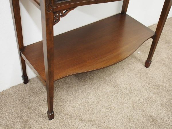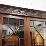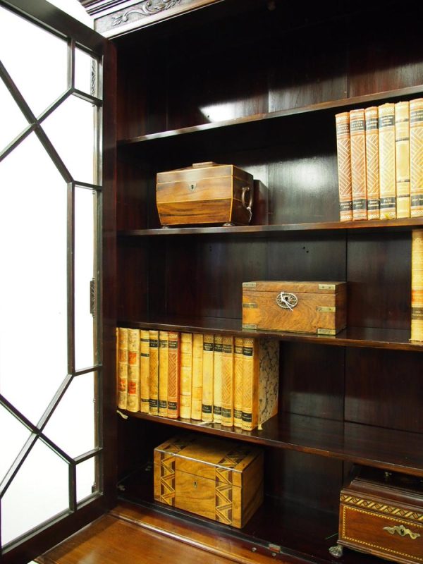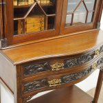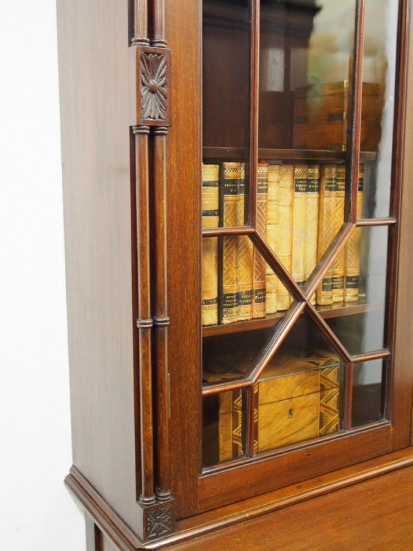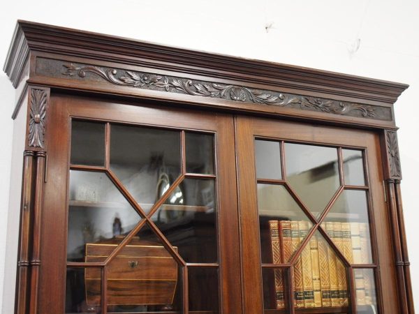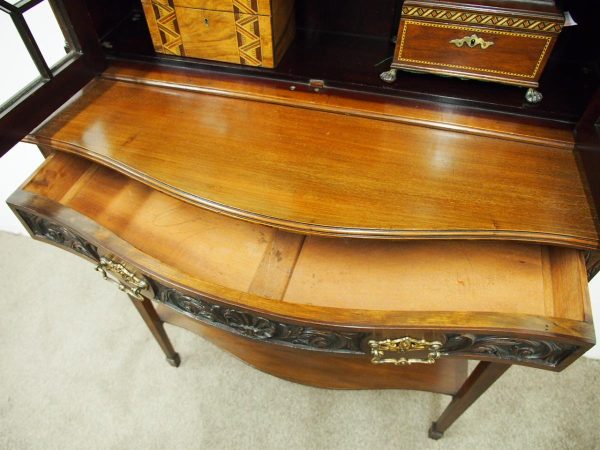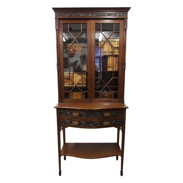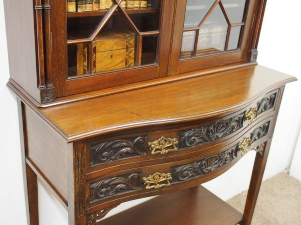 Circa 1890, carved mahogany cabinet or bookcase on stand. The moulded cornice sits over a deep foliate carved frieze, and has two astragal glazed doors enclosing 4 adjustable shelves. The serpentine fronted base has two foliate carved drawers with brass handles, and it is all over tapered, square legs. These are united by a shaped under stretcher, and finished on spade toes.