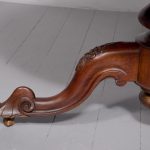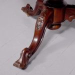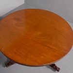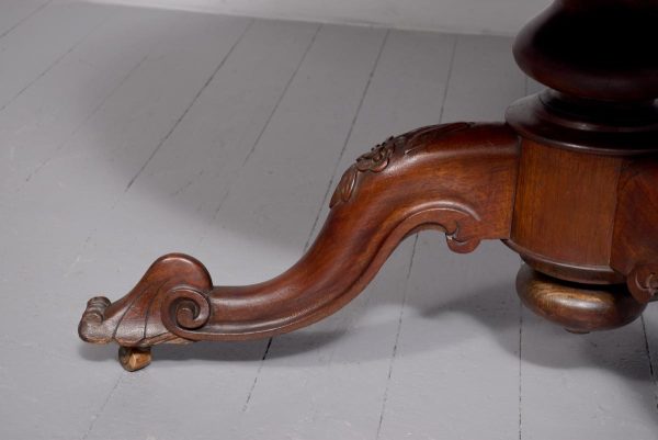 Circa 1870. A Mid-Victorian circular mahogany breakfast table, the top in fine figured mahogany with a simple fore-edge and frieze, the table rests on a sturdy block, supported on a turned stem, issuing three cabriole legs with foliate carving on the knees, a downward facing finial in the center and finishing on a well carved foliate carved feet, with the original castors beneath, the top is held in place by four pins.