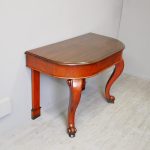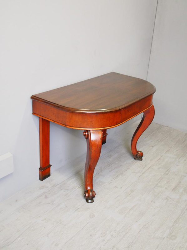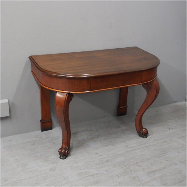 Circa 1870, Victorian mahogany demi-lune hall table or side table. The solid top is in figured Spanish mahogany with a moulded fore edge, over a deep cross banded frieze containing a centre drawer. This is supported in the front by bold cabriole legs terminating in scrolled feet and by flat supports to the rear.