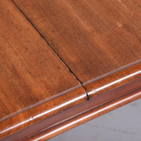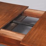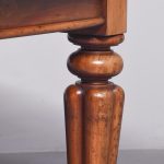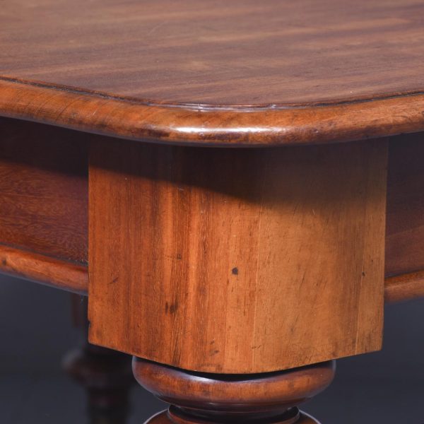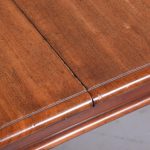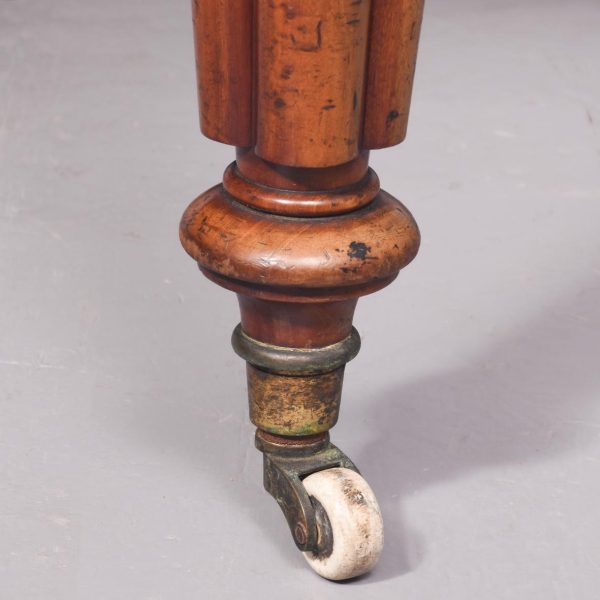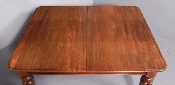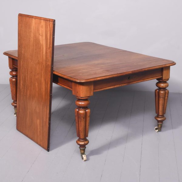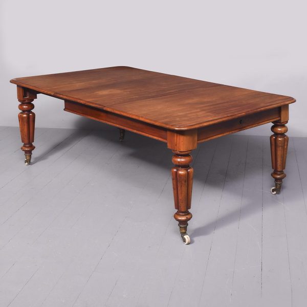 Circa 1860. An early Victorian mahogany dining table with one extra original leaf, the top in finely figured mahogany with moulded fore-edge and rounded corners, with a simple frieze with a beading beneath, all resting on four classic turned, fluted and tapering legs, finishing on a brass cup with the original porcelain casters beneath. The table comes with the original wind-out handle.