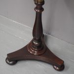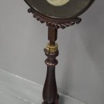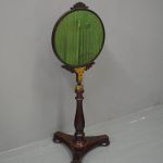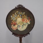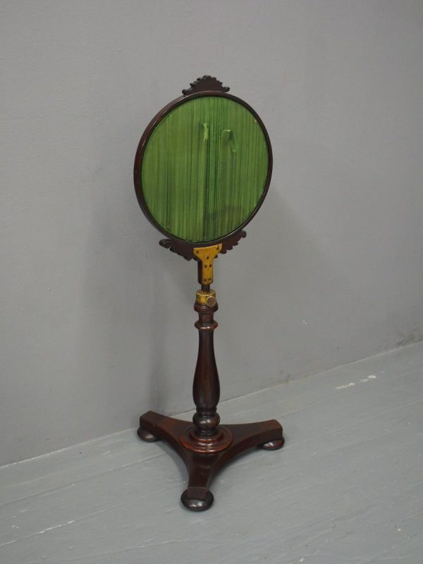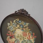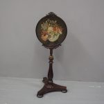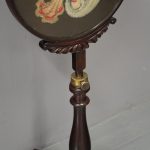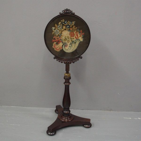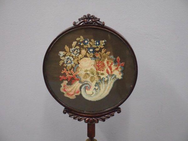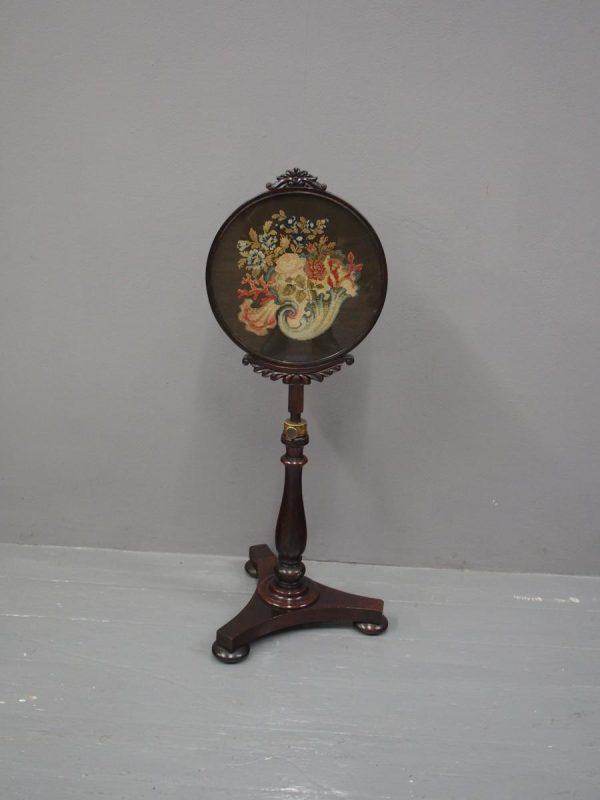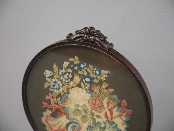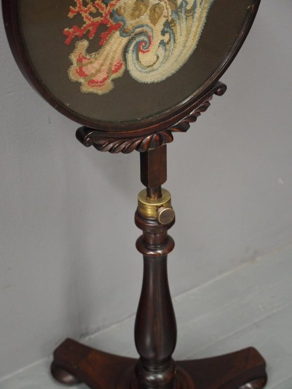 Circa 1840, early Victorian mahogany-framed, fire screen. The oval glazed, hand-embroidered gros point foliate scene is within a mahogany frame with carved foliate crest and base. The adjustable support is within a baluster-turned stem and all over a tripartite platform base on neat bun feet.