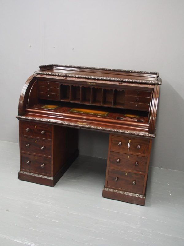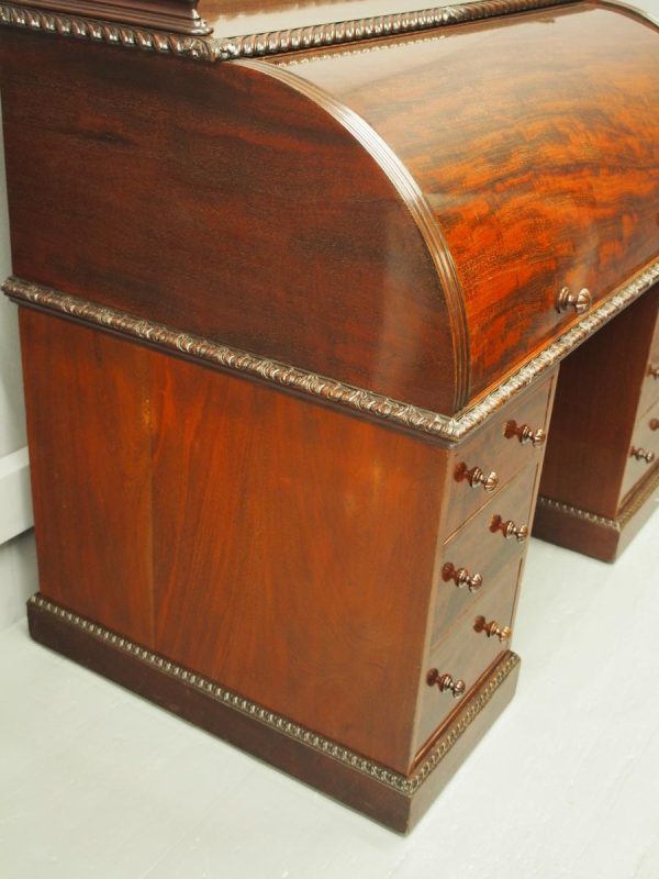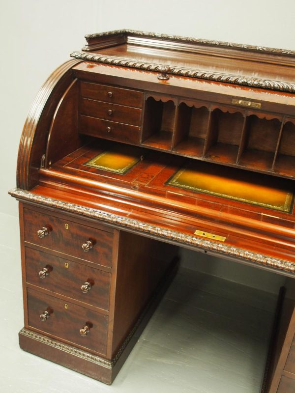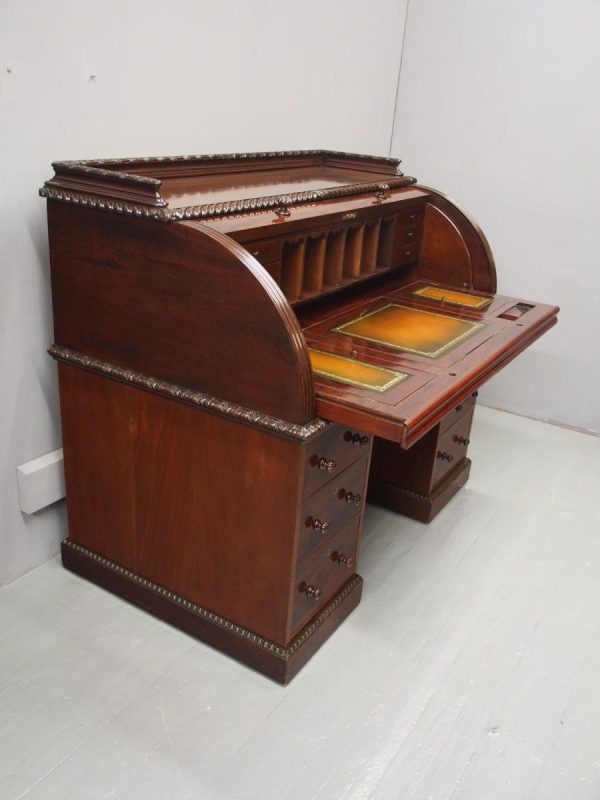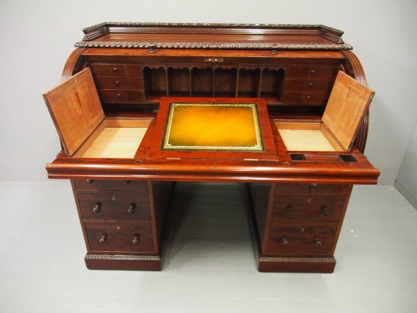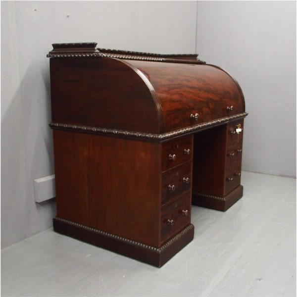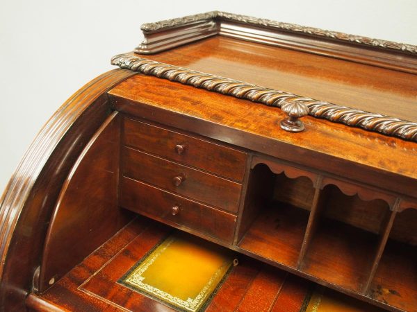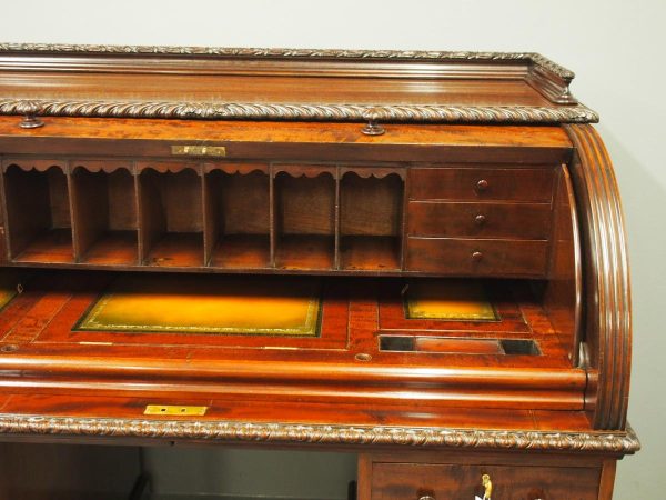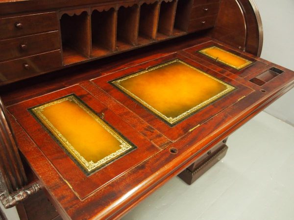 Circa late 19th century, mahogany roll top cylinder bureau. With a carved three quarter gallery with gadrooned fore-edge above a cylinder top opening to a configuration of pigeon holes and drawers. With a pull out slide with tooled leather writing slope (ratchet adjustable) flanked by similar leather insert compartments and a pen slide. Raised on banks of 3 graduated drawers with plinth bases and castors.
