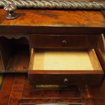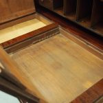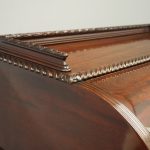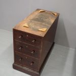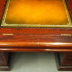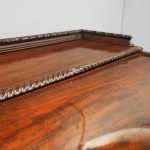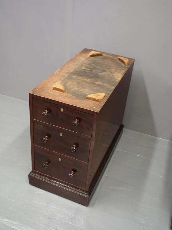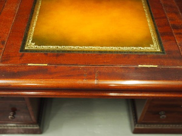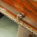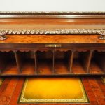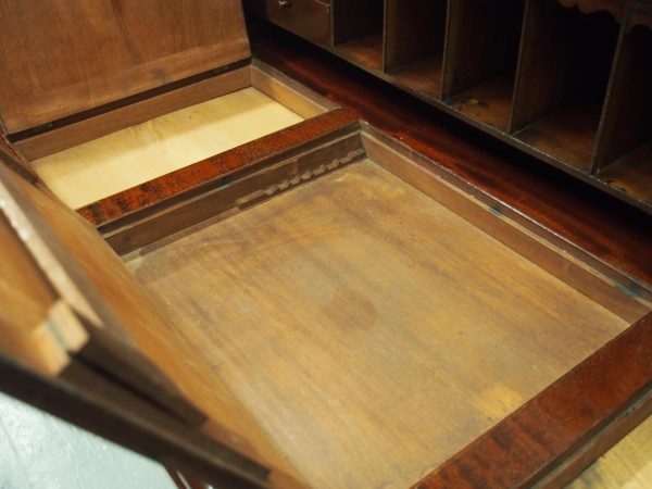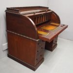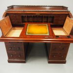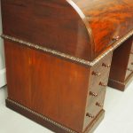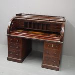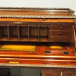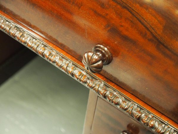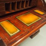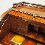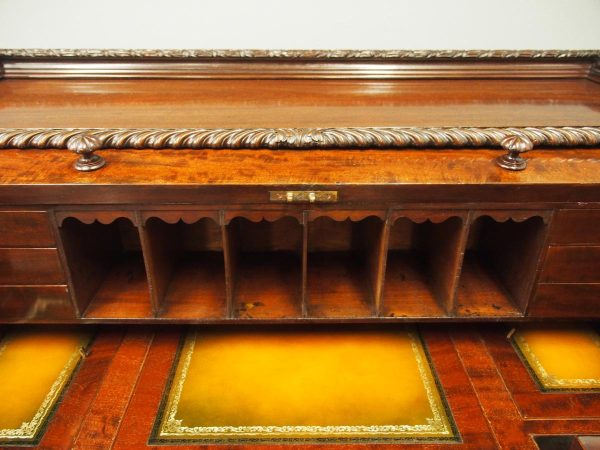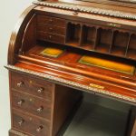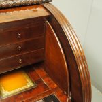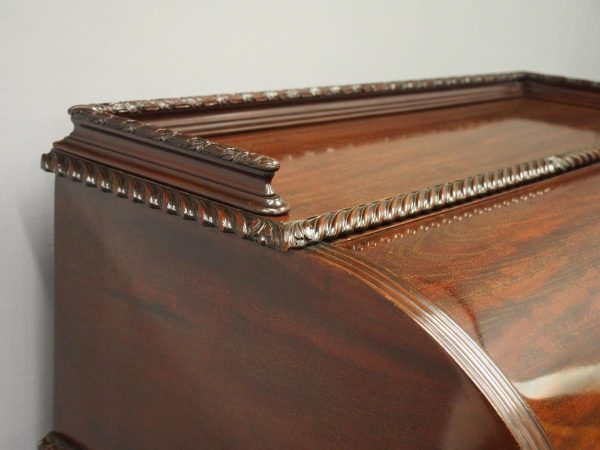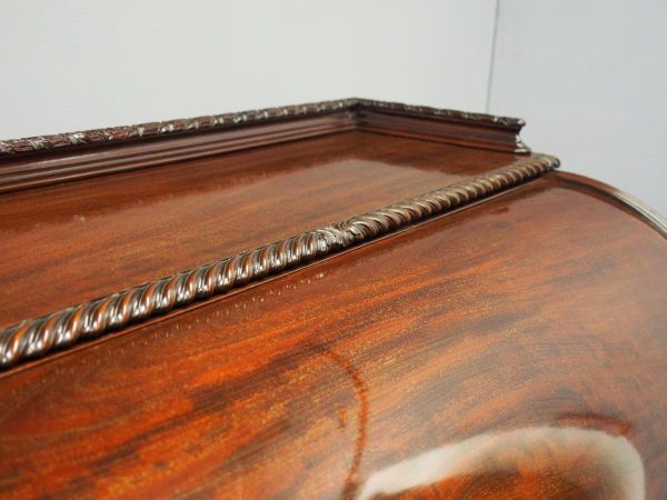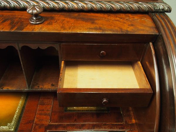 Circa late 19th century, mahogany roll top cylinder bureau. With a carved three quarter gallery with gadrooned fore-edge above a cylinder top opening to a configuration of pigeon holes and drawers. With a pull out slide with tooled leather writing slope (ratchet adjustable) flanked by similar leather insert compartments and a pen slide. Raised on banks of 3 graduated drawers with plinth bases and castors.