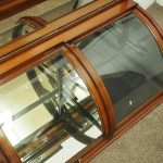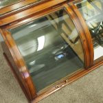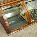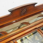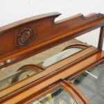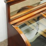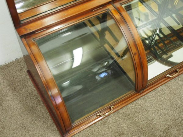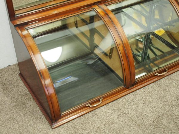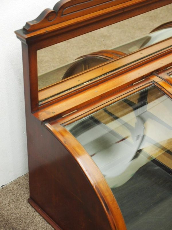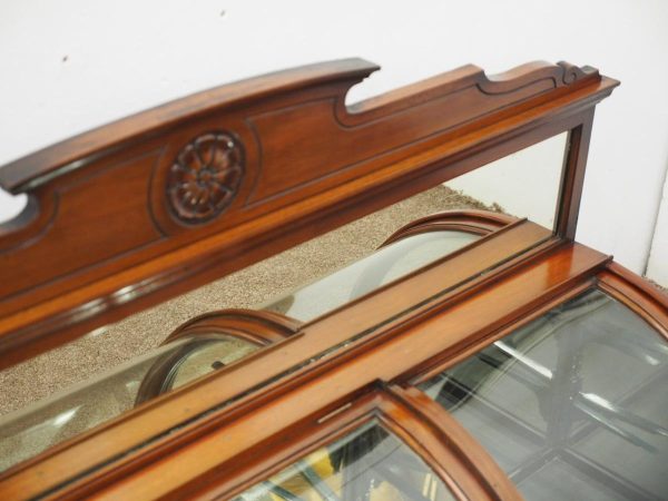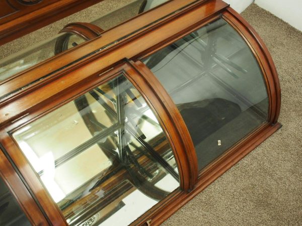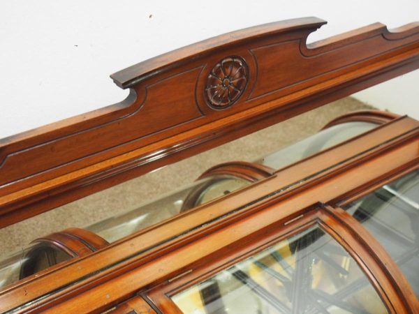 Circa 1870, Victorian mahogany showcase/shopfitting. With its curved and carved pediment and beneath this a long rectangular mirror. In front are 3 curved doors which have a mirrored back and sides for displaying the merchandise. There are small brackets either side for putting glass shelves. The first two curved sections have small copper lifting handles at the front and are hinged, open and held in place by a locking arm. Unusually the third curved section is open from behind for security reasons. The gables are mahogany and it finishes on a base with an ogee moulding around the front and back.