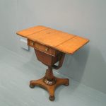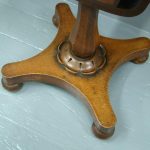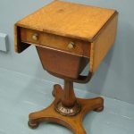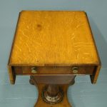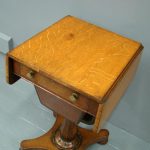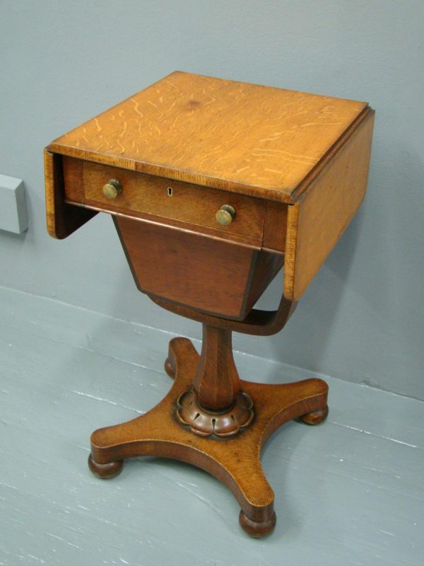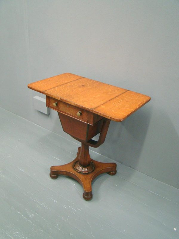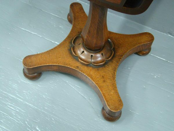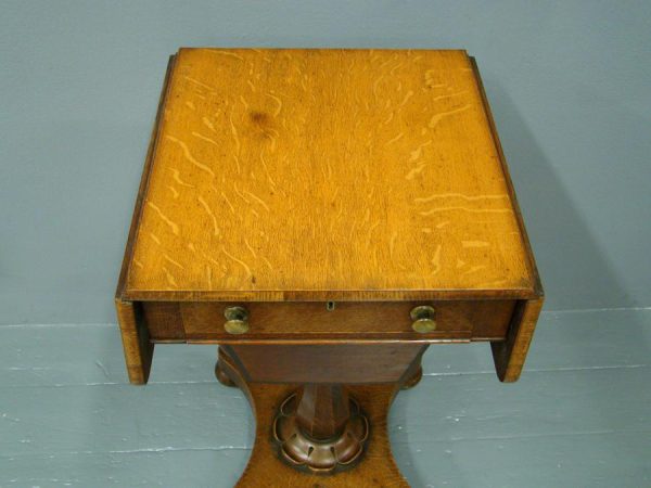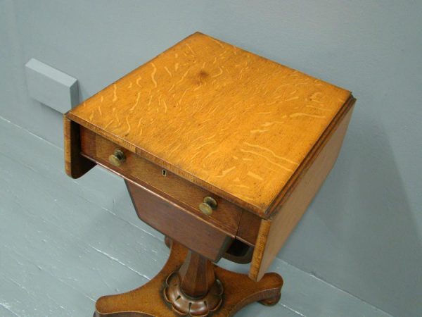 Circa 1840, early Victorian oak workbox or occasional table. The top is in a mellow coloured, figured quarter-cut oak with hinged side flaps. With fitted frieze drawer with horn handles and workbox beneath, it is all supported on a baluster octagonal stem with an acanthus carved collar, over a quadripartite plinth with flat bun feet with hidden brass castors.