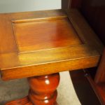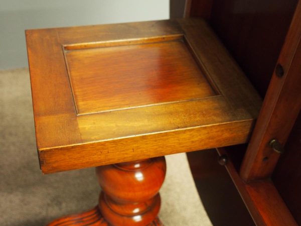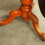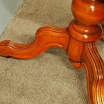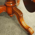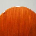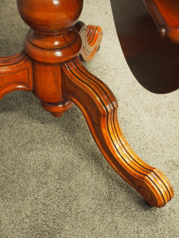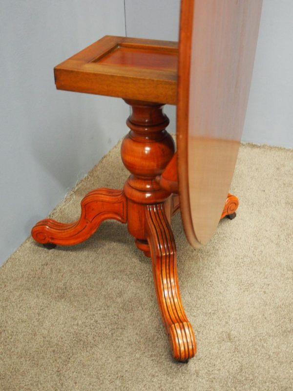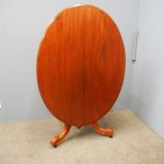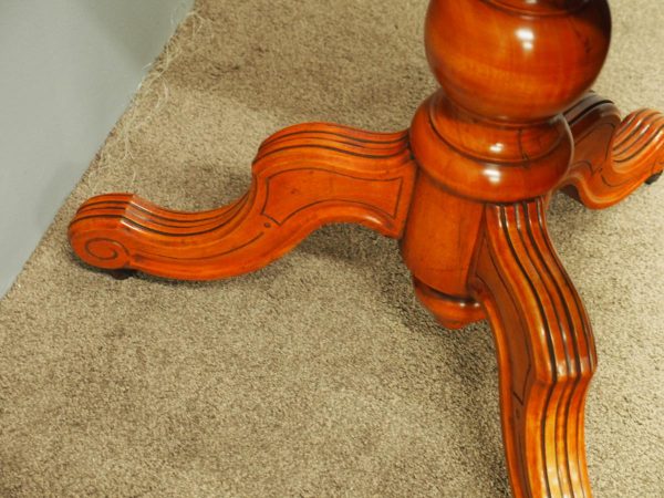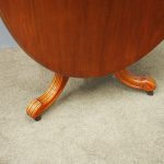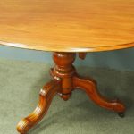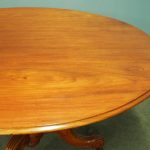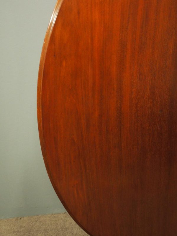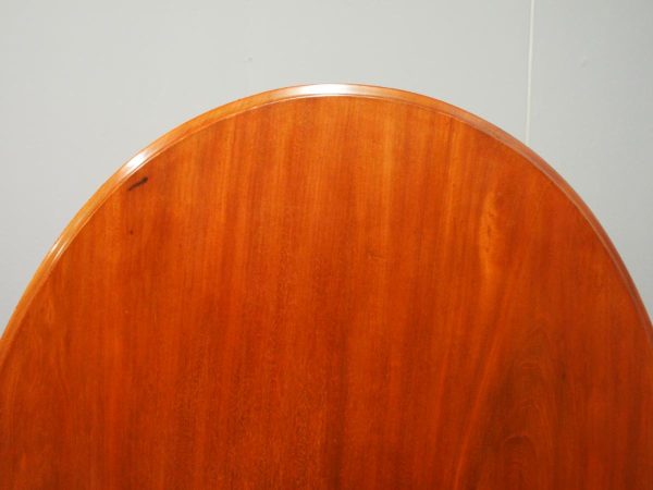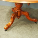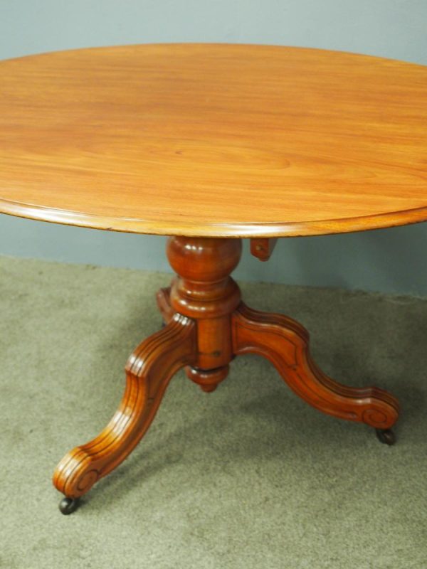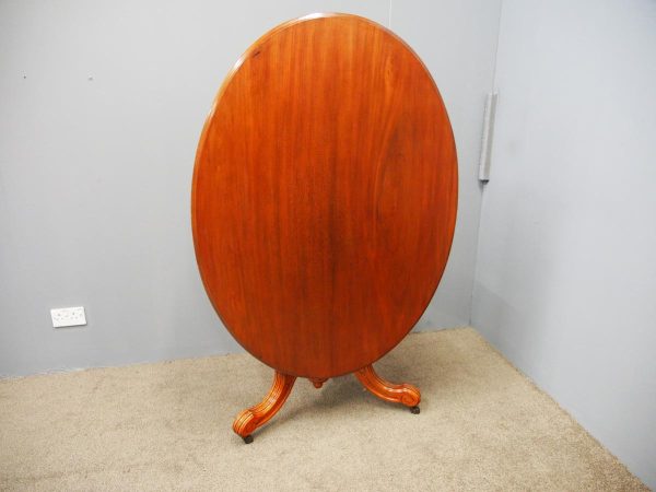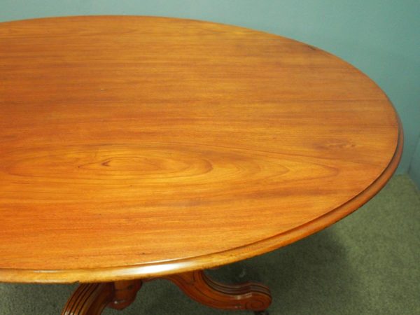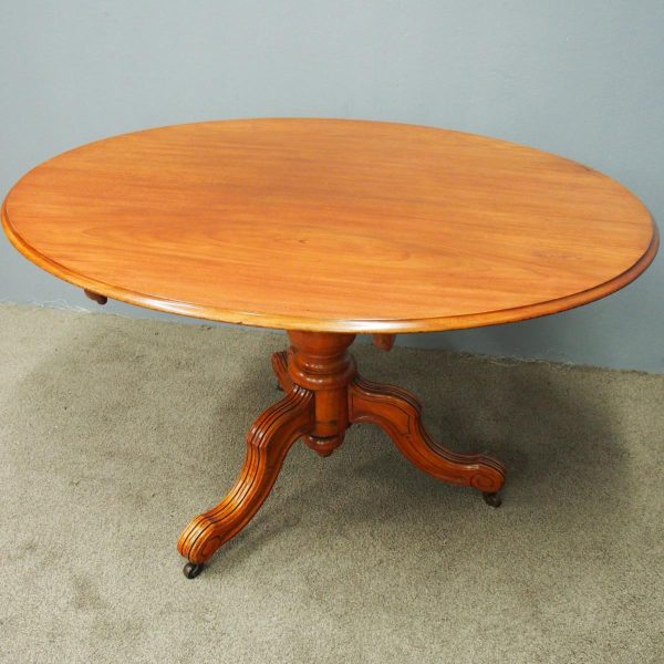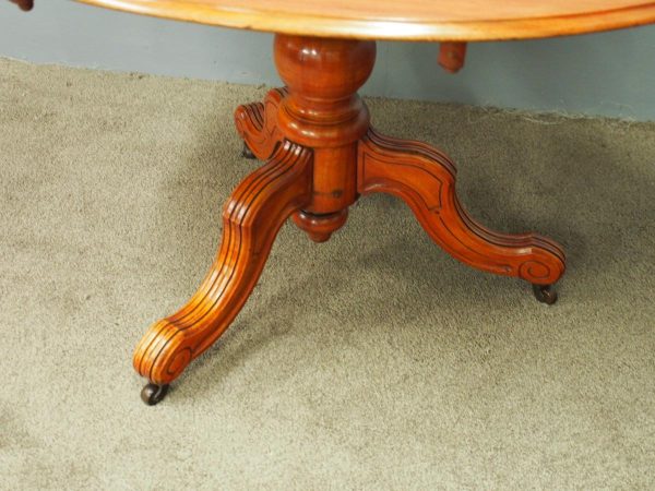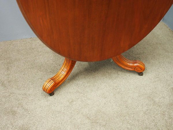 Circa 1870, Victorian oval shaped mahogany breakfast table. With ogee moulded edge, on a turned and tapering bulbous stem, with 3 cabriole, reeded legs extending from it. Standing on brass and brown porcelain castors.