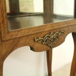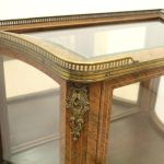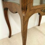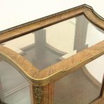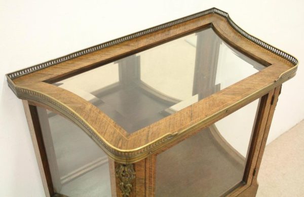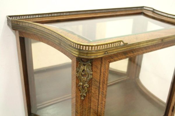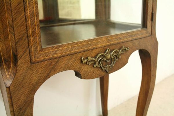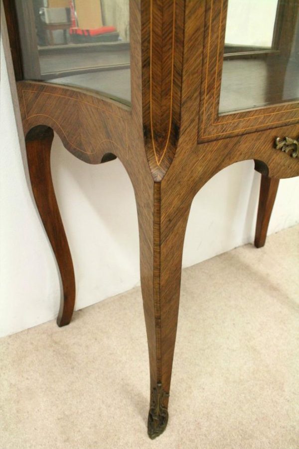 Circa 1880, Victorian inlaid rosewood vitrine/display cabinet, with shaped and bevelled glazed top and fretted brass gallery, ormolu mounts and sabots, on cabriole supports.