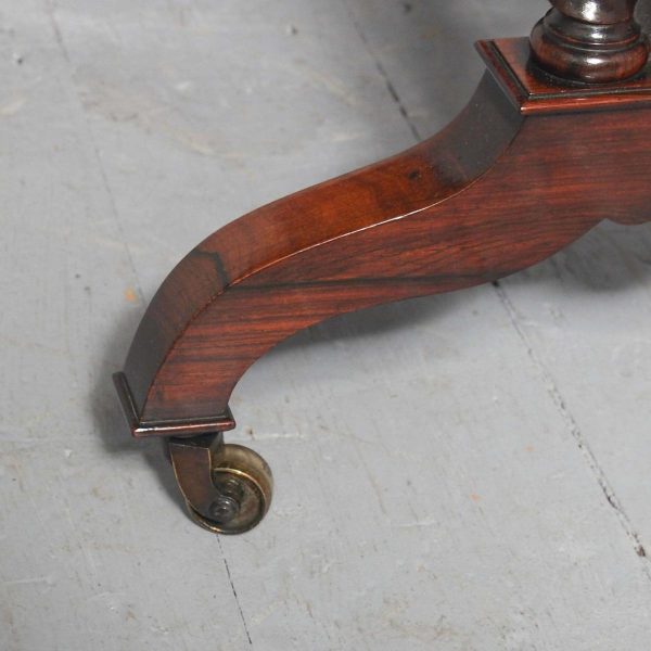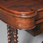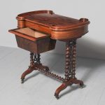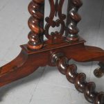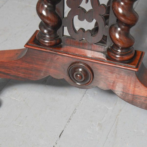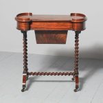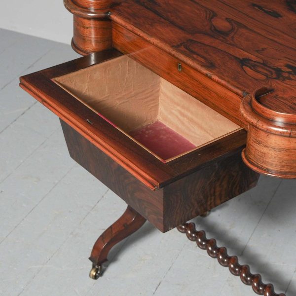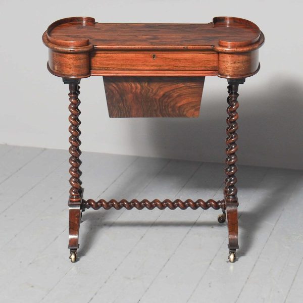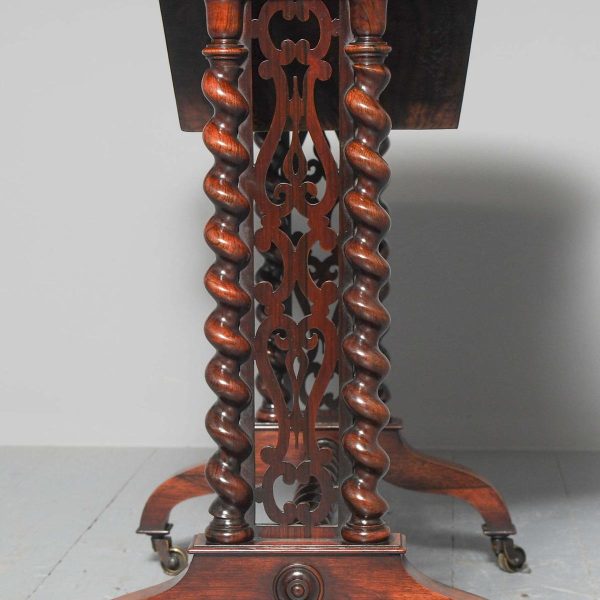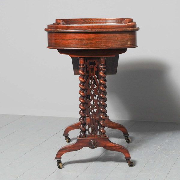 Circa 1860, quality Victorian rosewood side or work-table. The shaped top with curved low galleries in a beautifully figured Brazilian rosewood above a frieze drawer with cedar linings, original lock and key and a sliding work box. All supported on twin barley twist legs flanking open fret carvings; with a barley twist stretcher over arched feet on brass casters.