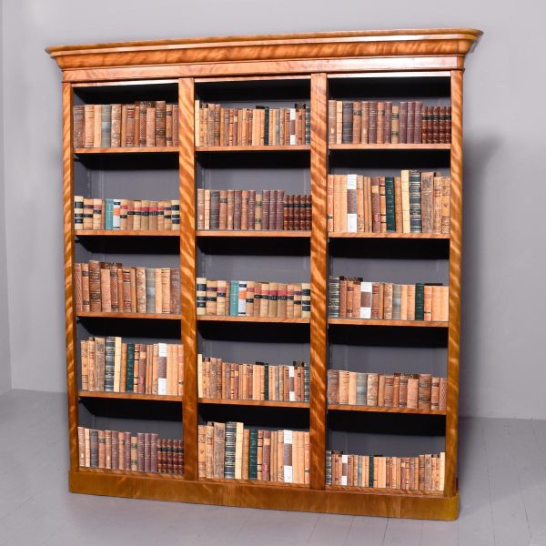 Circa 1860 with adaptations. Victorian Satin Birch Three Section Bookcase. Surmounted by typical early Victorian cornice with a crossbanded frieze, the three bookcase sections each with four adjustable shelves separated by simple pilasters. All sitting on an enclosed plinth base. Dismantles into 4 sections