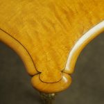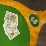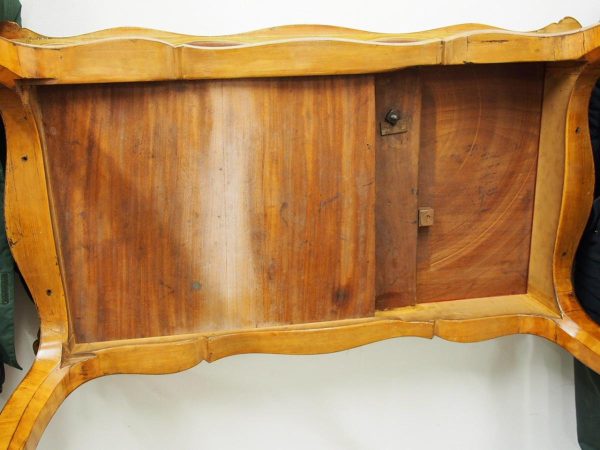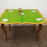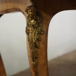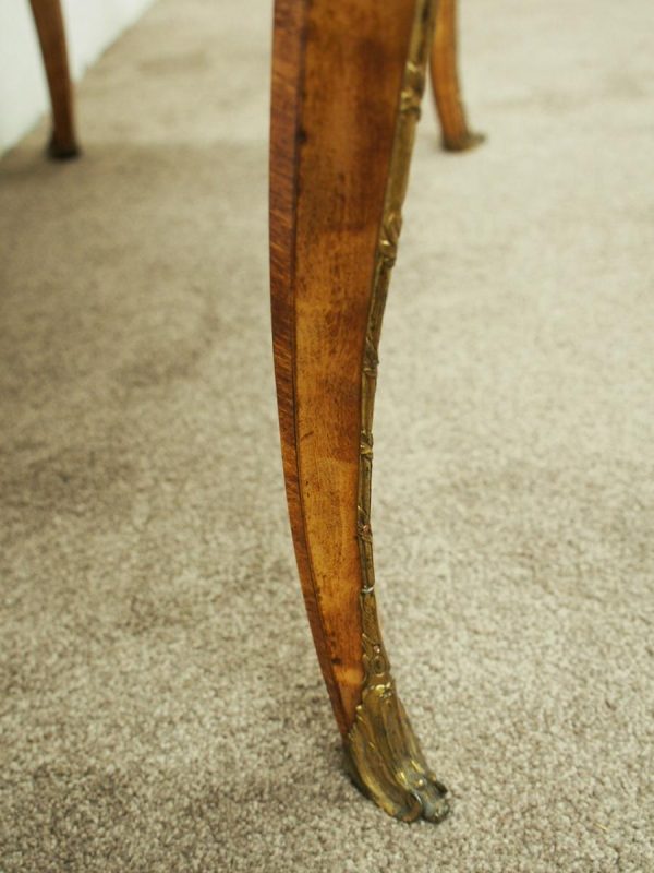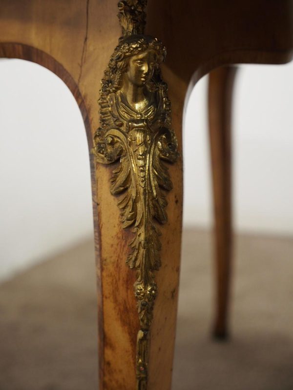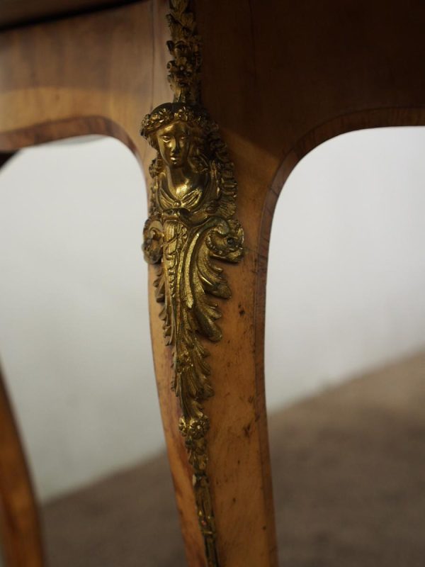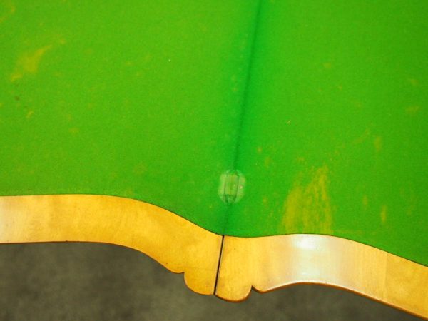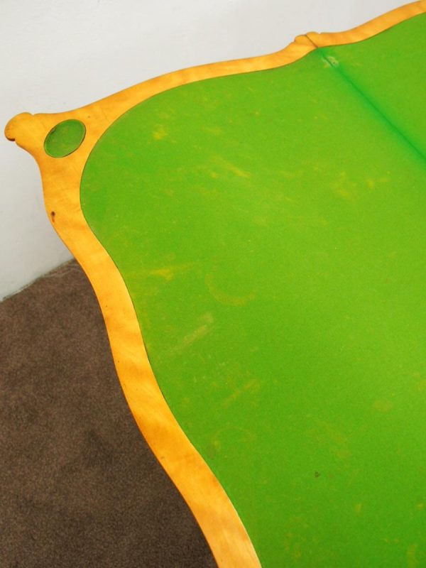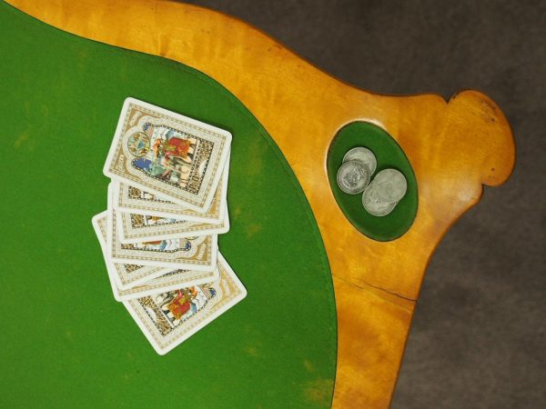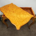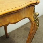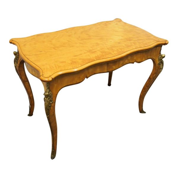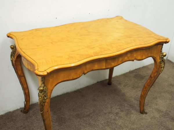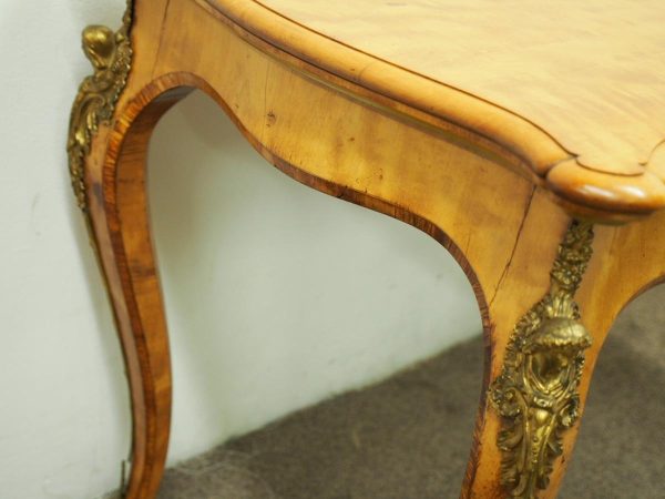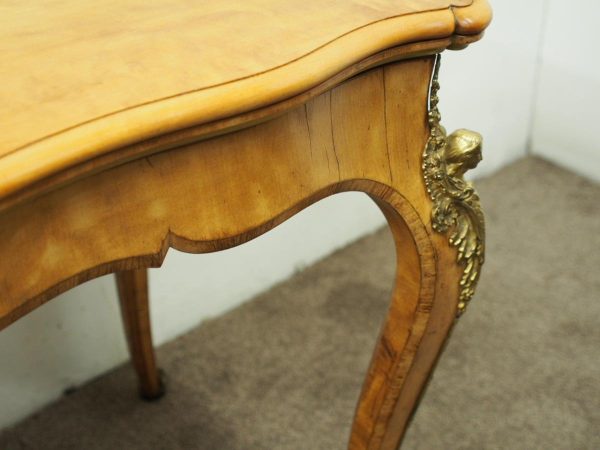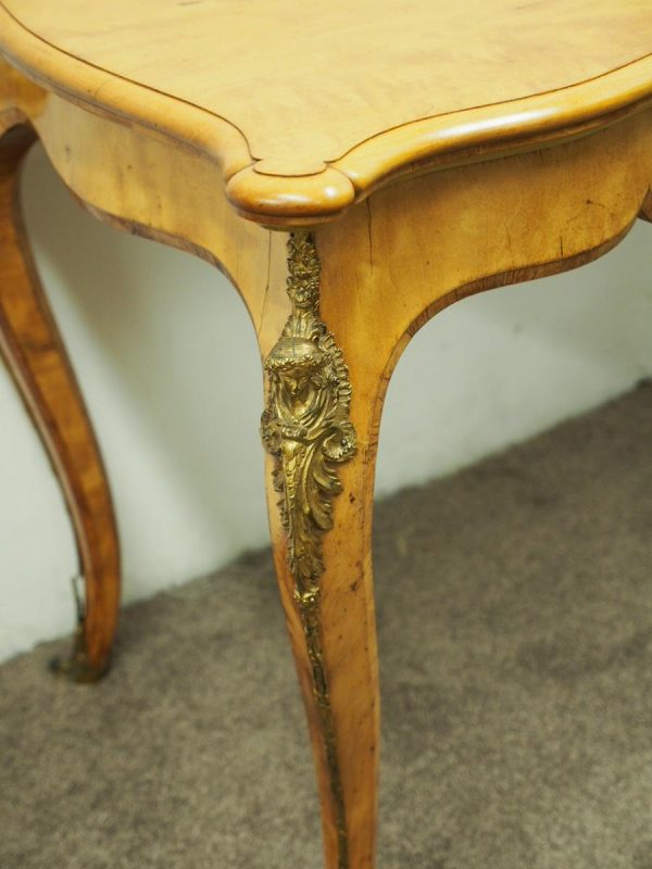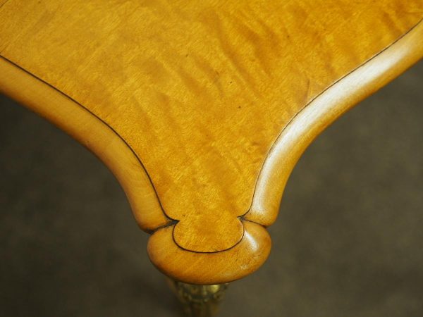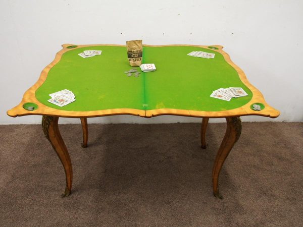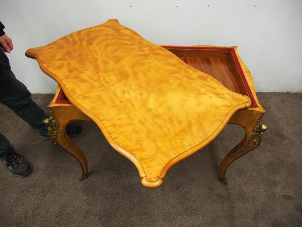 Circa 1860, rare Victorian satinwood fold over games table. As it is freestanding it could be used as a centre table. The shaped top is in figured satinwood and has a moulded edge over a shaped frieze, which swivels and opens to reveal a green baize lined interior with guinea wells and a hidden mahogany lined drawer. The cabriole supports have gilt bronze caryatid mounts and extend down to sabots.