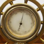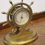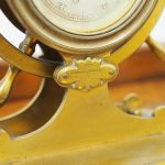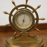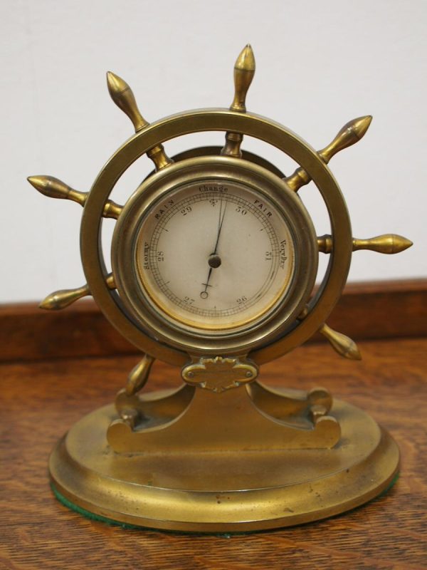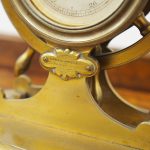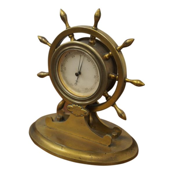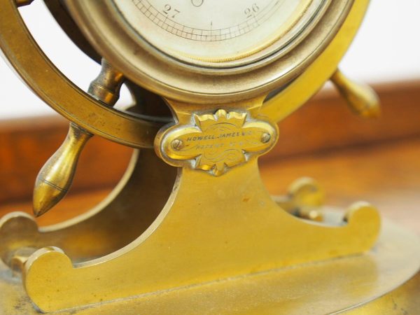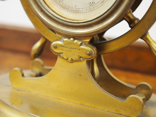 Circa 1880, Victorian barometer with makers plaque on the front. It reads ‘Howard James and Company, Regent Street, W.’ The whole piece is contained in a faux ships wheel with matte gilding and in the centre is a silver dial with the adjustments. The wheel moves separately from the central dial for adjusting the variations in weather. It stands on a pair of trestle ends which are linked by the central bezel and all stands on an oval enclosed base with a concave section and felt beneath.
