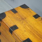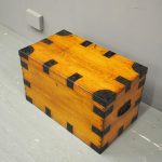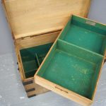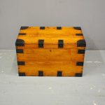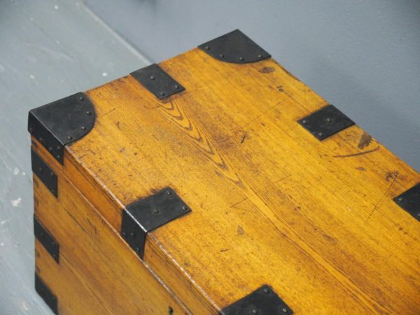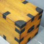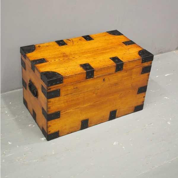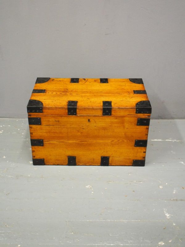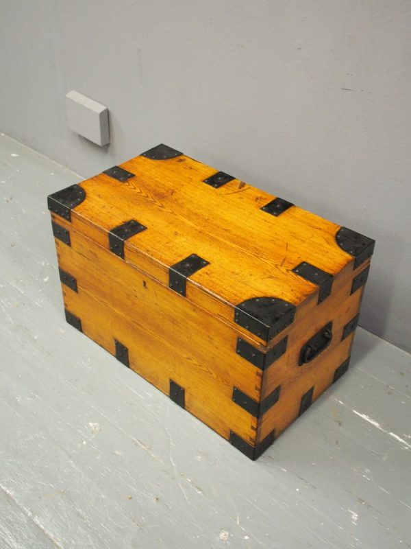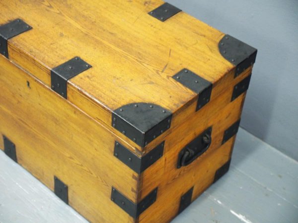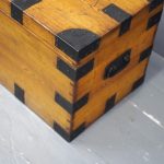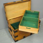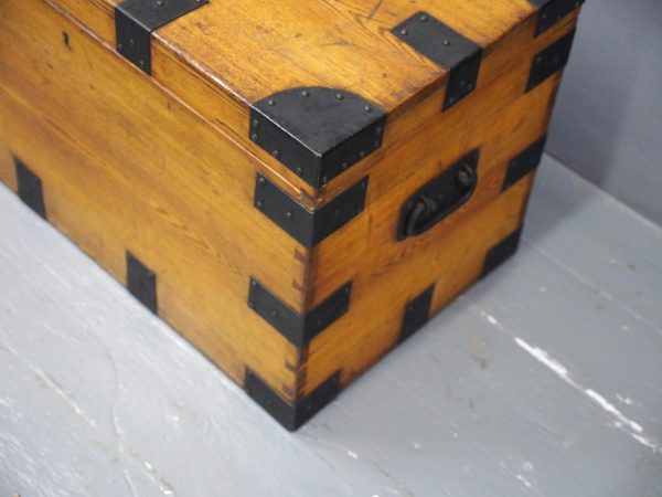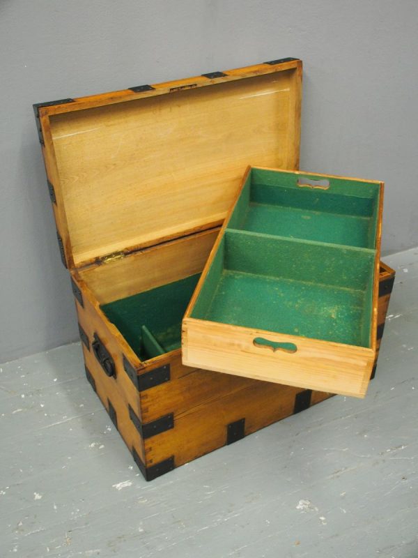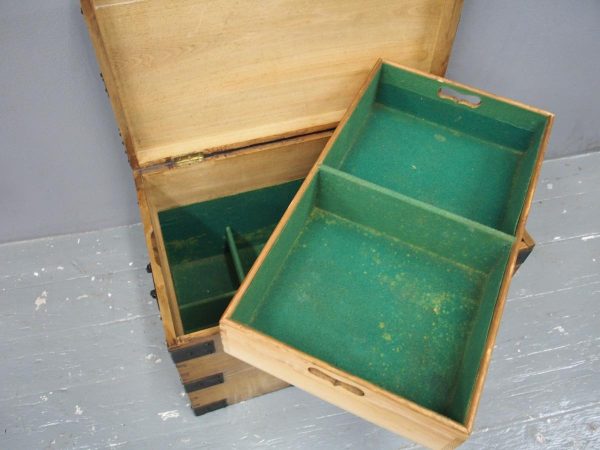 Circa 1860, Victorian steel bound ash silver trunk, in a figured golden ash with steel strapping, corners and original carrying handles. The top opening to a removable fitted tray exposing a fitted interior.