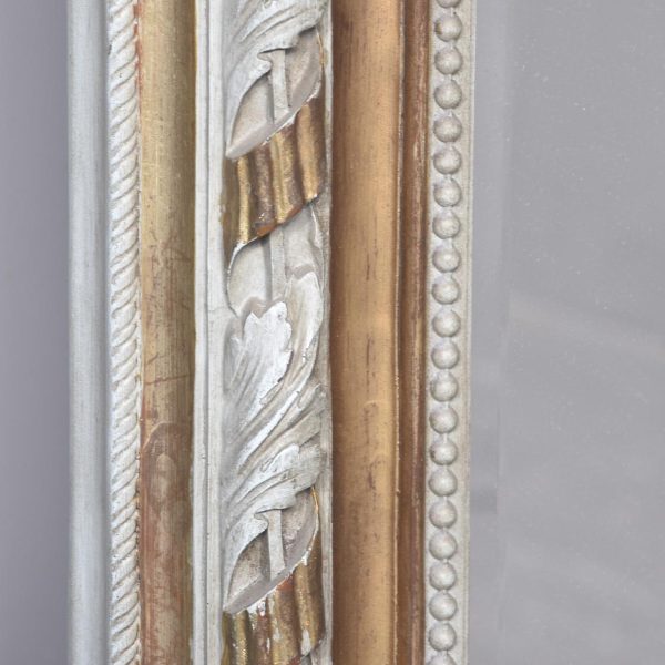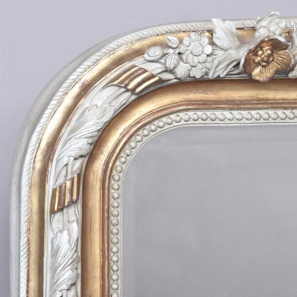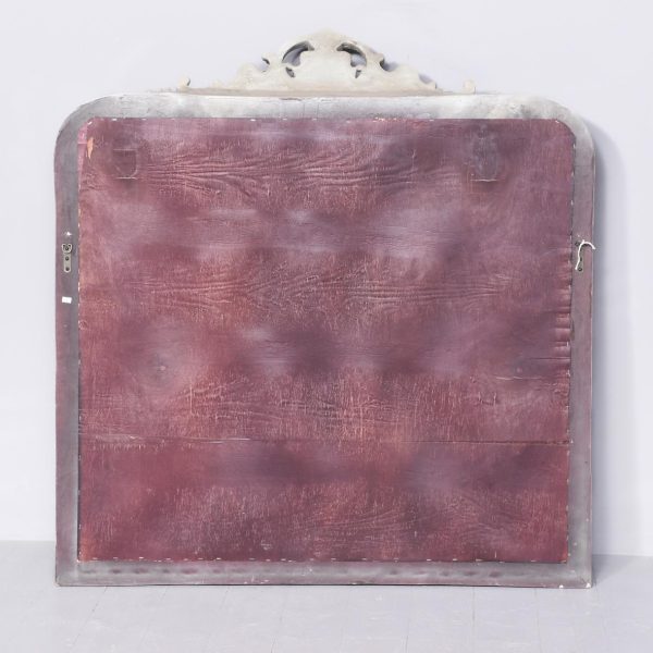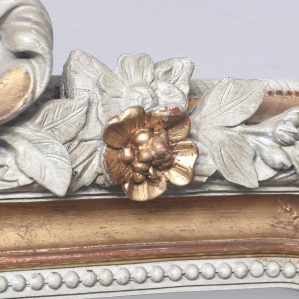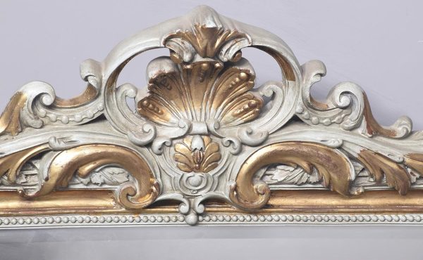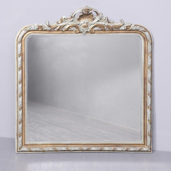 Circa 2000. Victorian style reproduction painted and gilded overmantel mirror. The top surmounted by rococo scrolls, conch shells and gilded flower heads above the foliate framed mirror with a beaded inner slip and bevel glass mirror in excellent condition.