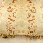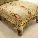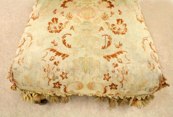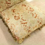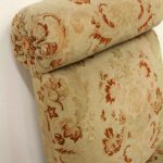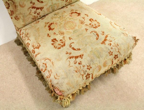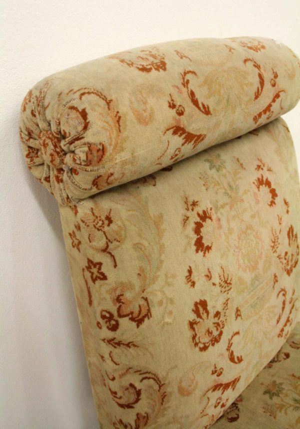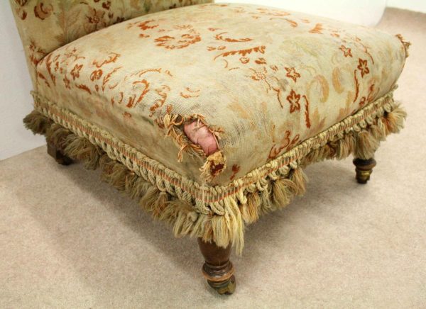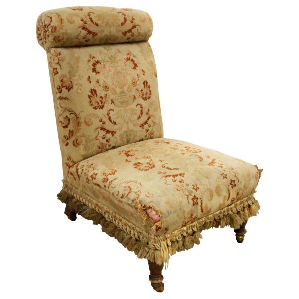 Victorian upholstered nursing chair, with cream foliate fabric, on turned legs and ceramic castors.