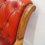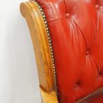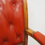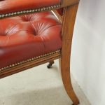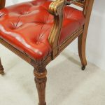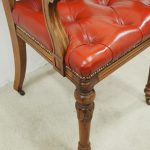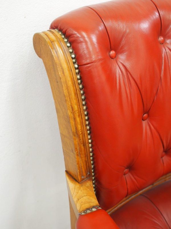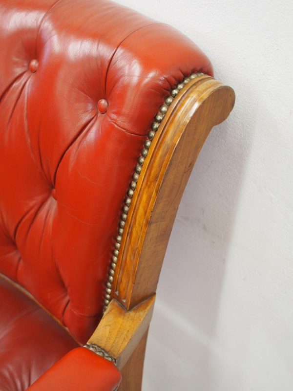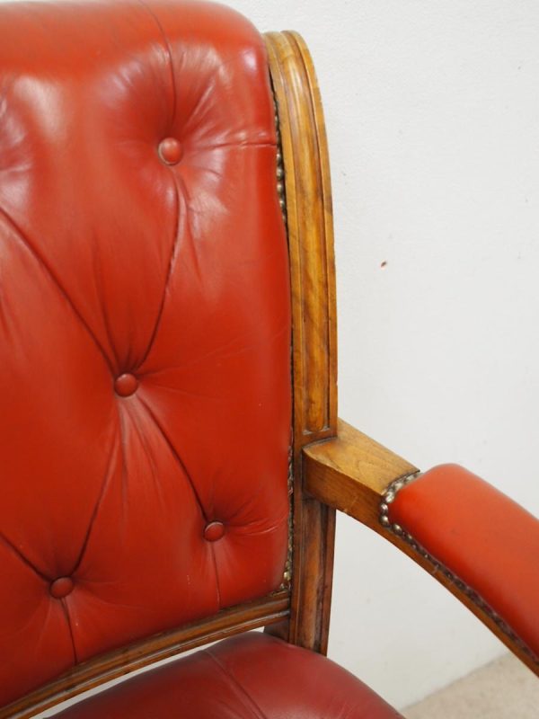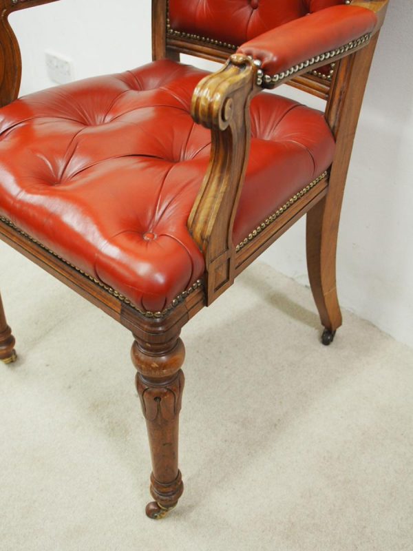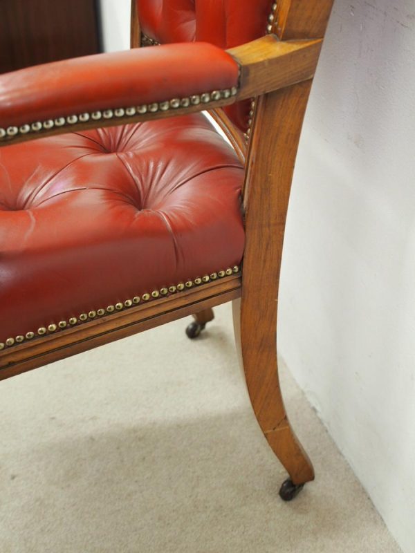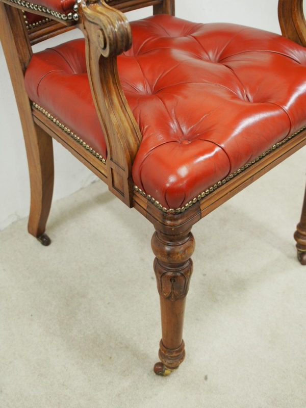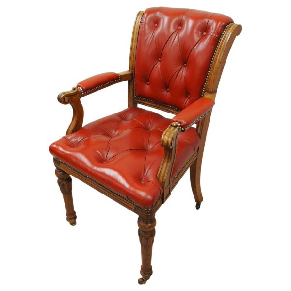 Circa 1860, unusual walnut arm chair with red leather deep button back and seat. With reeded and scrolling uprights, all the leather is held in place by close brass studding, and there are padded elbow rests. The back legs are slightly outswept, there is a shaped apron and the front legs have foliate carving to the top, finishing on brass and brown porcelain castors.