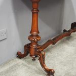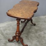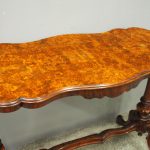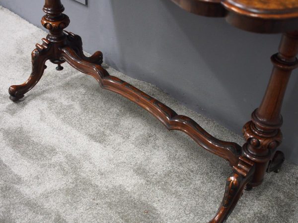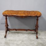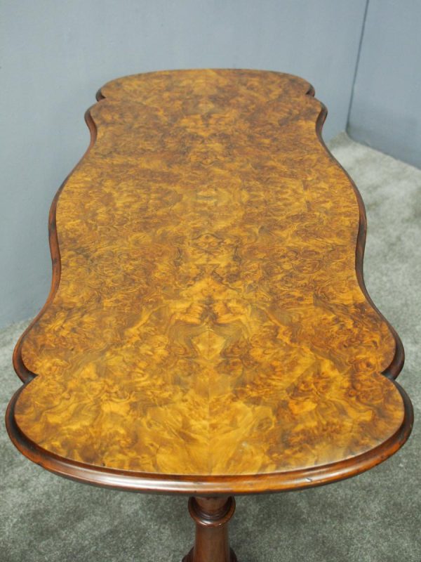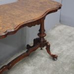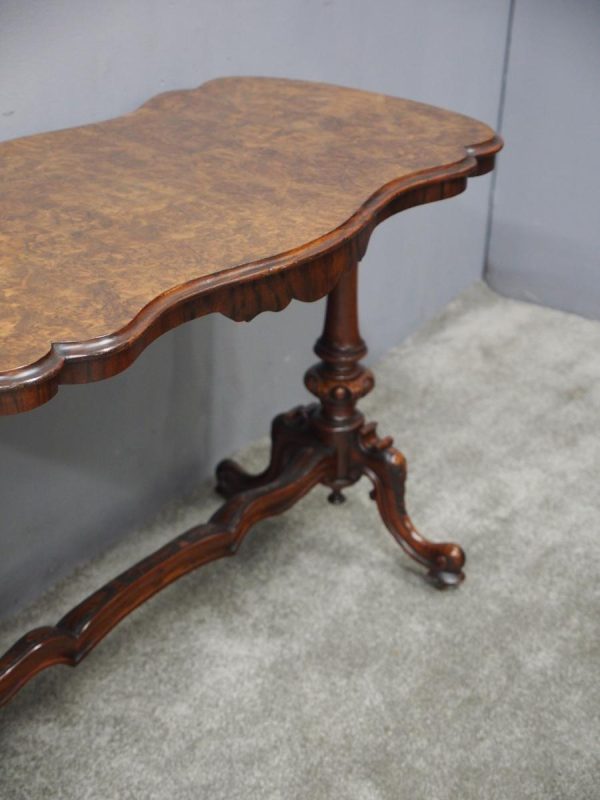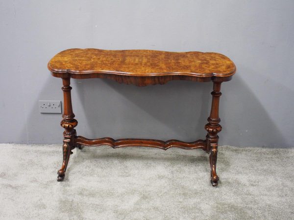 Circa 1870, exhibition quality Victorian burr walnut shaped window table by W. Richardson and Co, Darlington. With mirrored burr walnut veneers to the top and an ogee moulded fore-edge about a shaped apron, it stands on ring turned, tapering and carved columns. These lead on to well carved cabriole legs, finishing on brass castors and united by a shaped and carved stretcher.