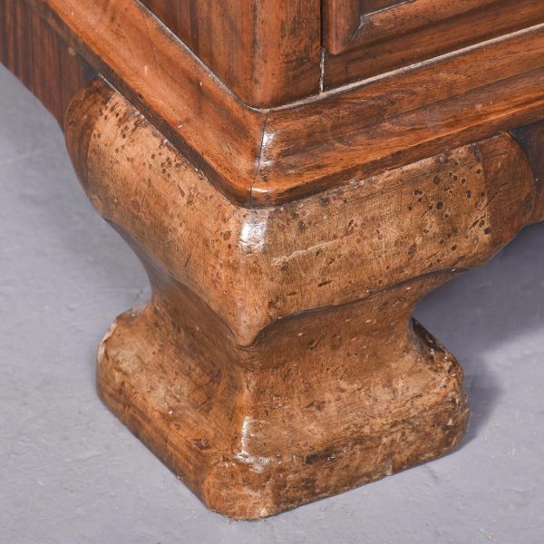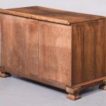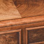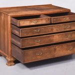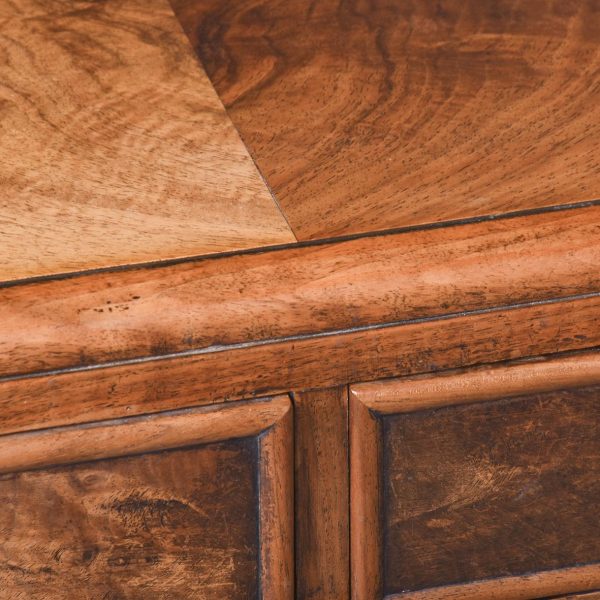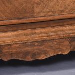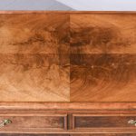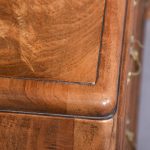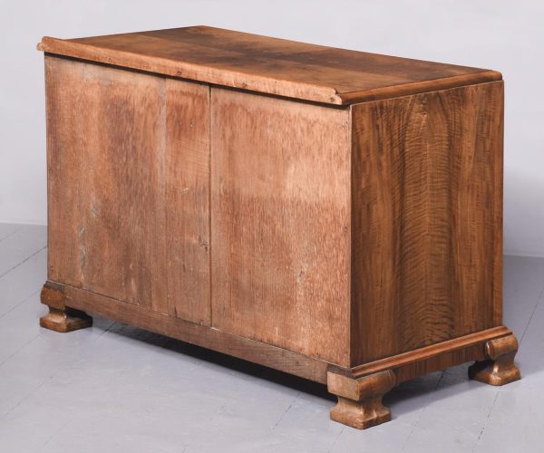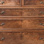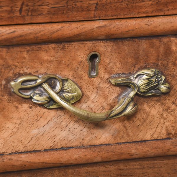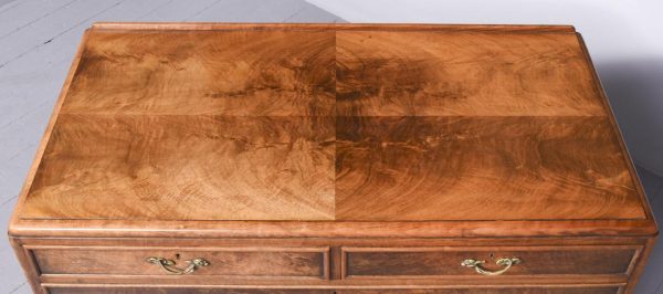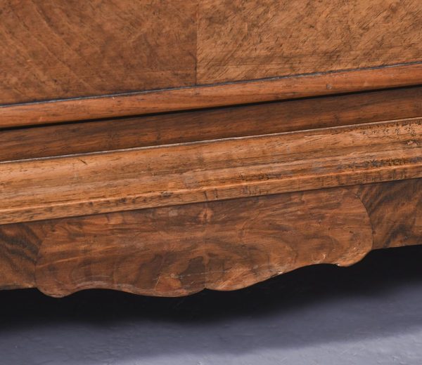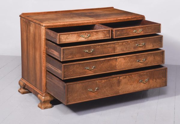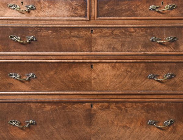 Circa 1900. A walnut chest of drawers by ‘Whytock & Reid of Edinburgh’. The quarter veneered burr-walnut top with a small back gallery and moulded fore-edge, over a configuration of two short over three full length graduating drawers each with elegant cast brass foliate handles with lily leaf and flowers, beneath the bottom drawer there is a moulding and a shaped frieze, all resting on four classic feet, with ‘Sir Robert Lorimer’ features.