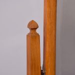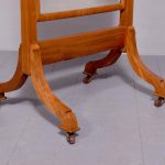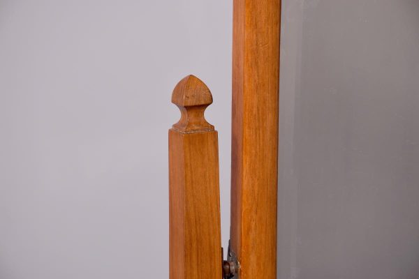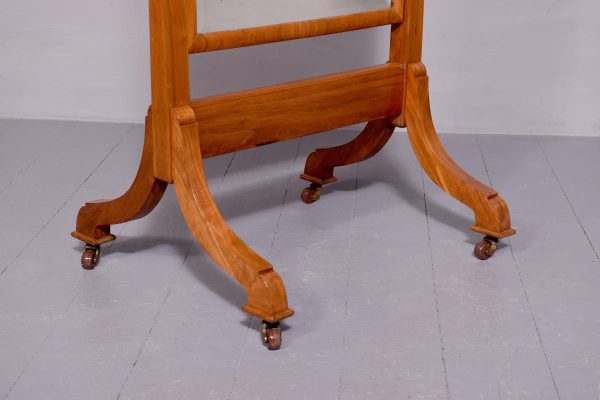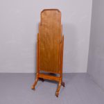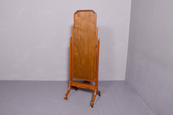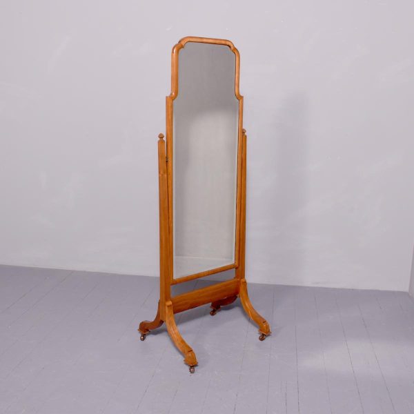 Circa 1920s. A stylish walnut Queen Anne Style walnut framed cheval mirror, the shaped frame with a bevel edge mirror insert, supported on two tapering uprights surmounted by finials, braced by large polished stretcher, resting on four sabre legs finishing on brass and brown porcelain castors.