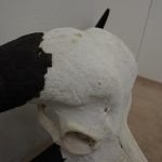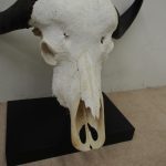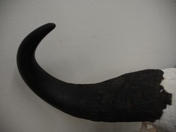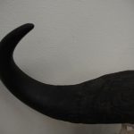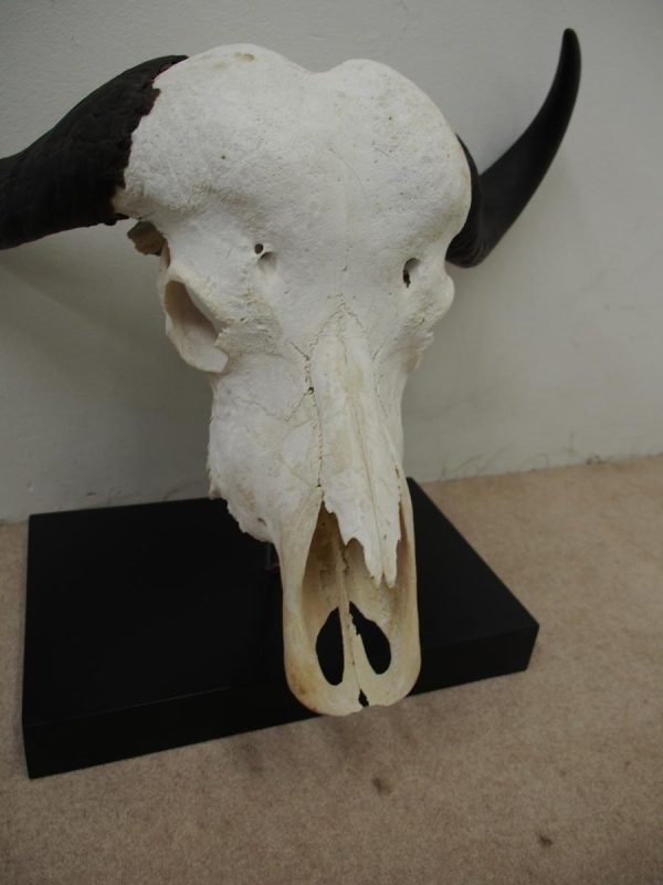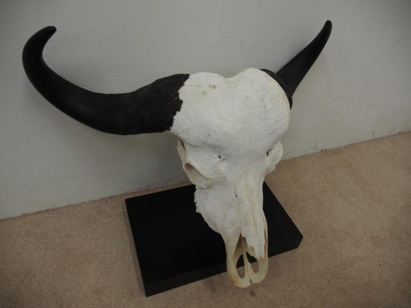 Early part of the 20th century, skull and horns of a South African water buffalo. The head has been cleaned and the horns have been polished, and it has been attached to a large ebonised base.