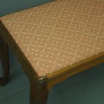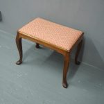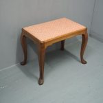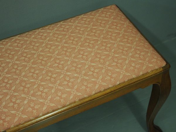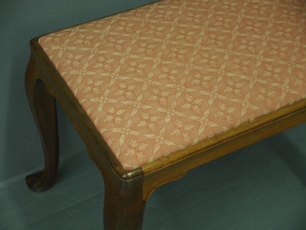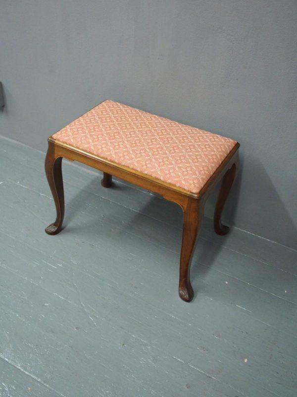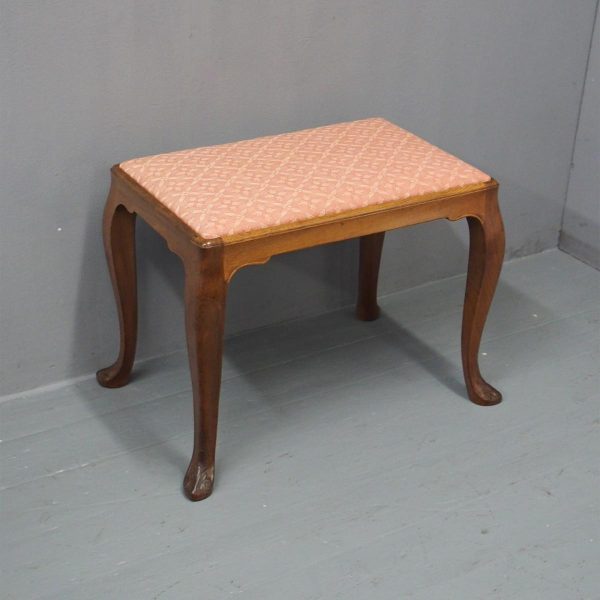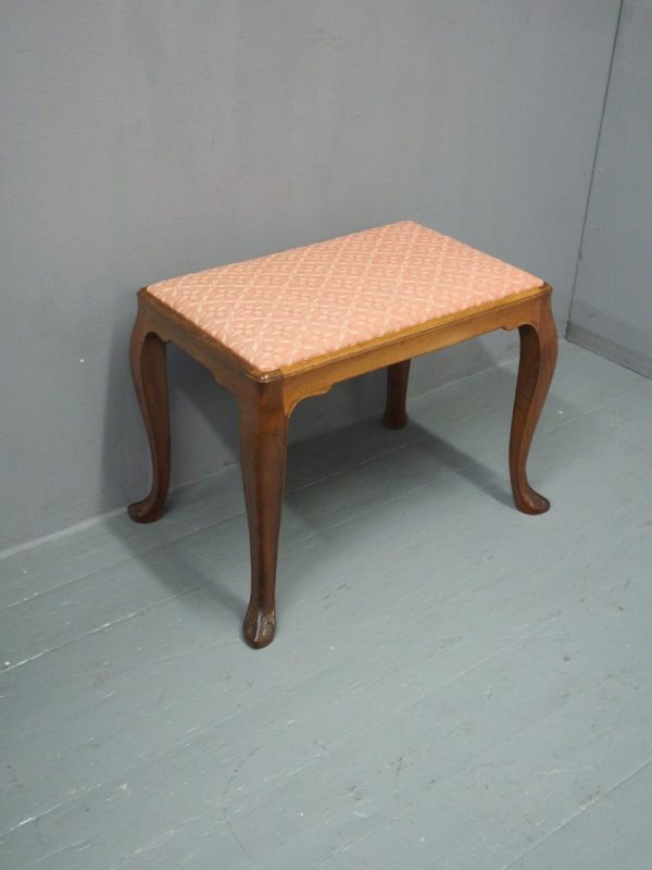 Circa 1930, tall walnut footstool by Whytock and Reid. The pop out upholstered seat is covered in a quality patterned linen type material. The moulded seat rails are supported on cabriole legs with neat quarter brackets and classical Lorimer style foliate carved toes.