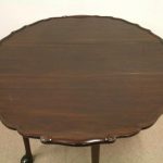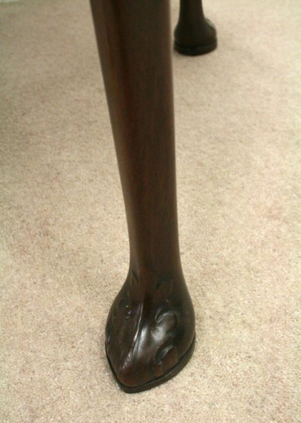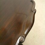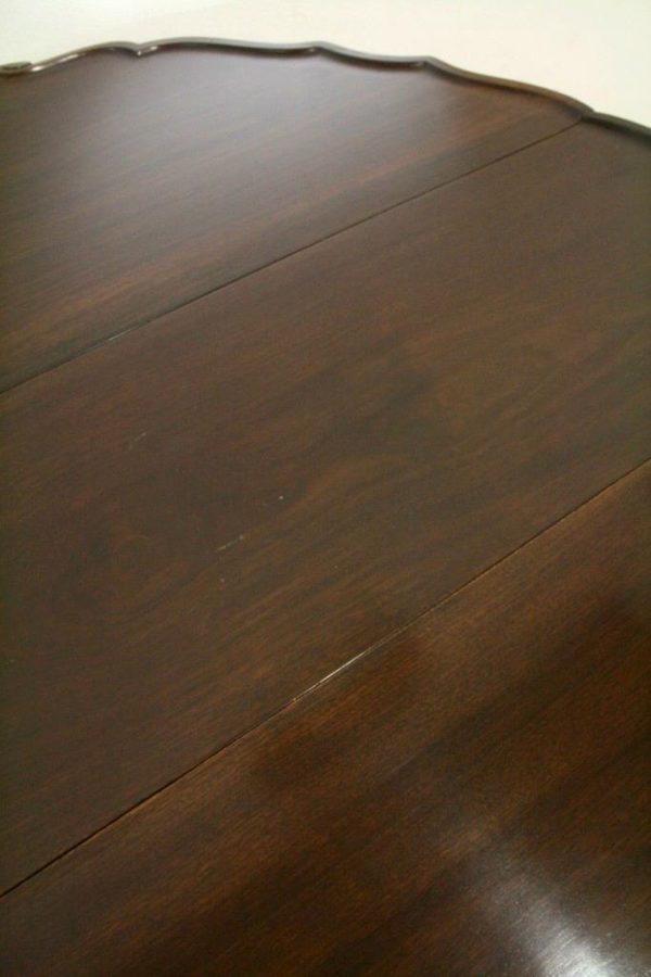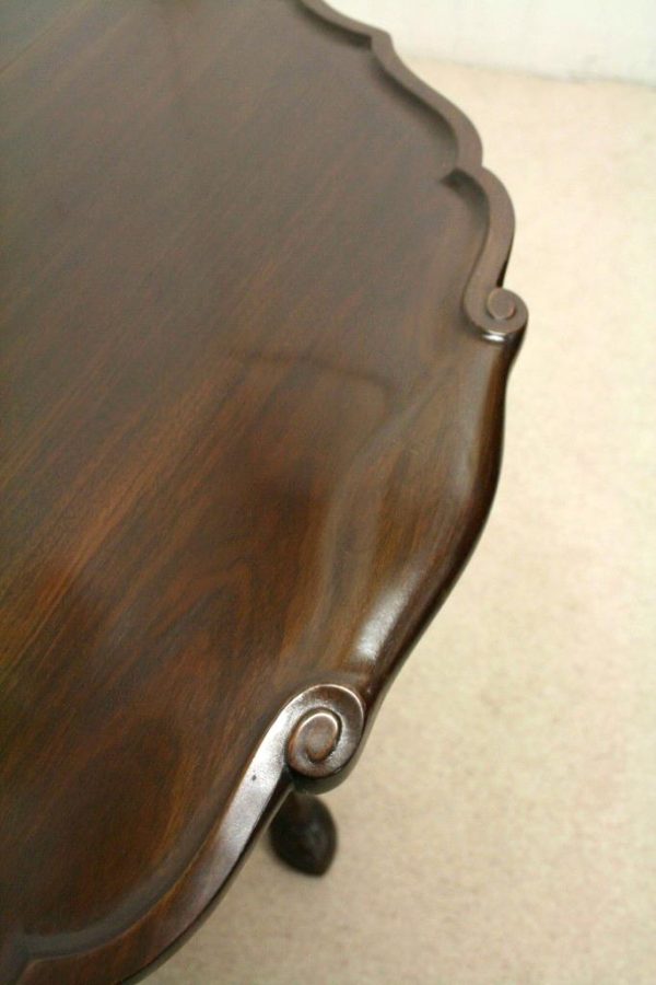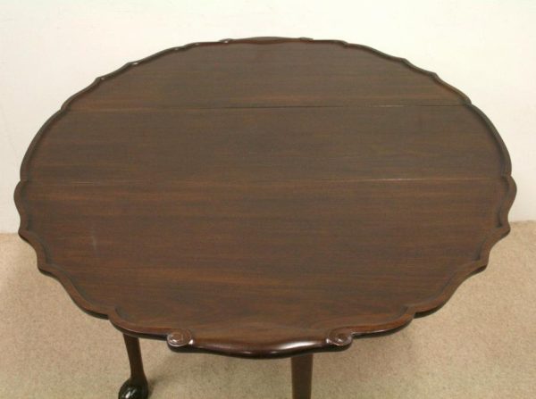 Circa 1920, mahogany drop leaf table by Whytock & Reid of Edinburgh. The unusual table when opened is similar in style to a George III supper table, except with the distinctive Whytock & Reid carvings at the ends. The solid mahogany top stands on a mahogany frame which has a gate leg action and elegant tapering legs finishing in a stylised foot with foliate carving. The table is elegant both open and closed, retains its original patination, has good colour and is sturdy.
