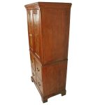 Circa 1900. An unusual and stylish two-part cabinet by ‘Whytock and Reid of Edinburgh’, in oak and pollard elm, the top section with a pair of cupboards which open to reveal an interior with two adjustable shelves, beneath this there is a moulded section, the base with four large, each with pollard elm facings and a pair of cast brass swan neck handles. Beneath this there are further mouldings and the two-part piece rests on classic bracket feet.