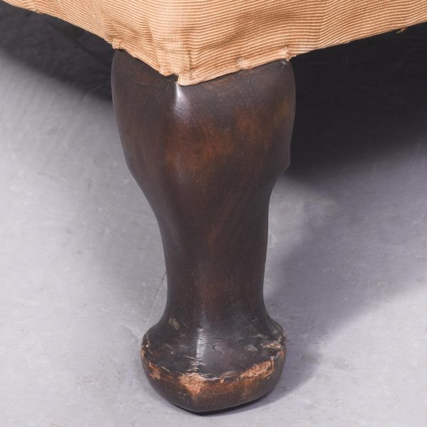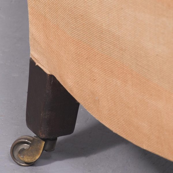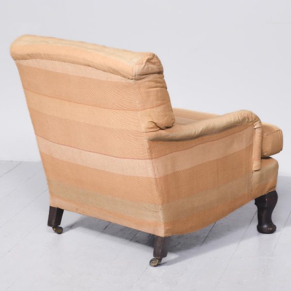 Circa 1920s. A large upholstered easy chair by ‘Whytock & Reid of Edinburgh’. The chair requiring reupholstery with a classic down feathered upholstered back. The upholstered arms and seat with removable cushion, back legs are slightly out swept finishing with brass castors and front legs, ‘Lorimer’ in style finishing on an elegant, elongated pad foot.