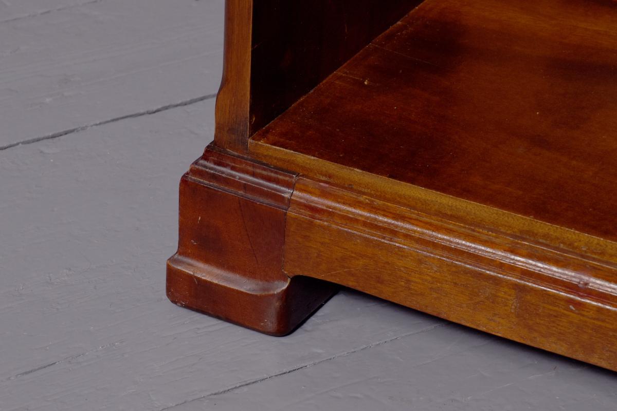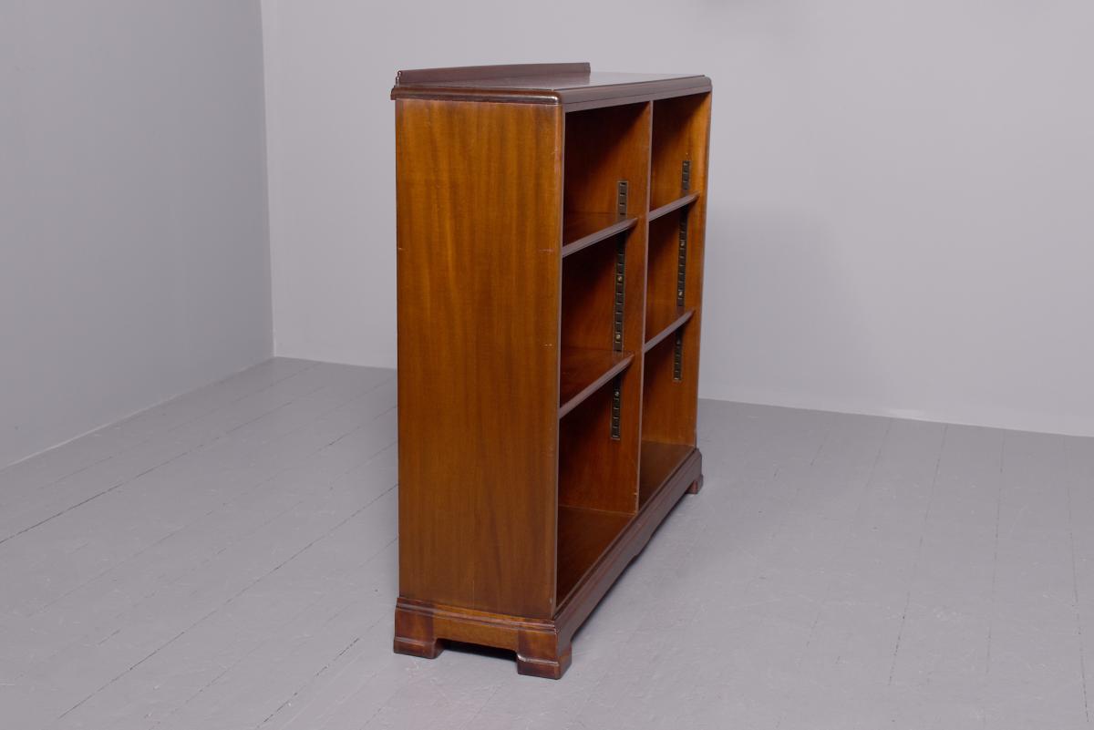 Circa 1920s. Mahogany open bookcase by ‘Whytock & Reid of Edinburgh’, the solid top with a small shaped ledge to the back and moulded fore-edge, the front with two sections each with two adjustable mahogany shelves with  stylish facings, separated by a simple mahogany upright, beneath the bottom shelf a stylish moulding and the bookcase rests on classic ‘Whytock & Reid’ feet.