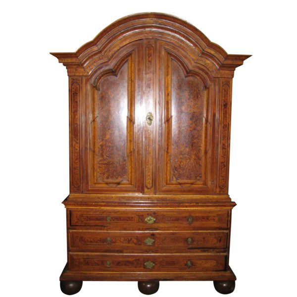 Circa 1700, very stylish early Lombardy mulberry and fruit wood linen press. The stylish architectural pediment has multiple mouldings between the outside and the inner doors which continue around the side. At the front there are two large doors with raised fielded panels and Flemish style framing. The centre panels are of mulberry as are the ogee mouldings on the side and there are multiple inlays of satinwood and ebony. The doors have a very stylish escutcheon and original key, and open to reveal a section inside with a series of double shelves with drawers in between. The drawers are veneered in mulberry and at the top there are some shelves with rounded mouldings on the front. The doors are pin hinged. On the top gables there are inlaid panels at the side again with geometric patterns in different woods. The similar pattern occurs on the base. Beneath the top section there are several mouldings with the facings of the mouldings veneered in mulberry also. At the bottom there is a configuration of three long full length drawers that graduate from top to bottom. The drawers have very stylish escutcheons, with an unusual lifting handle on the escutcheon and lion mask handles left and right with ring support lifts protruding from the mouth of the lion. Beneath the bottom drawer there is an extremely deep ogee moulding and the whole piece stands on large bulbous feet giving it a very stylish look to it. The piece is a good colour and great condition.