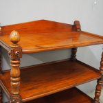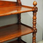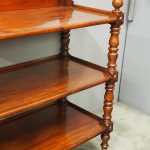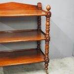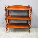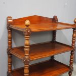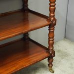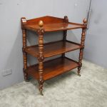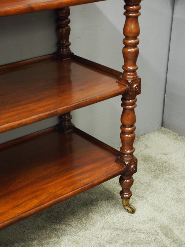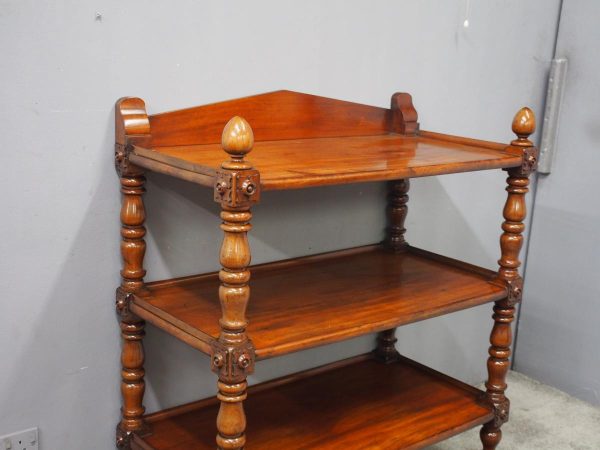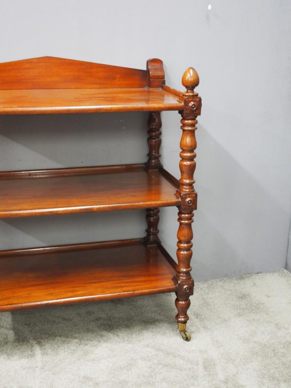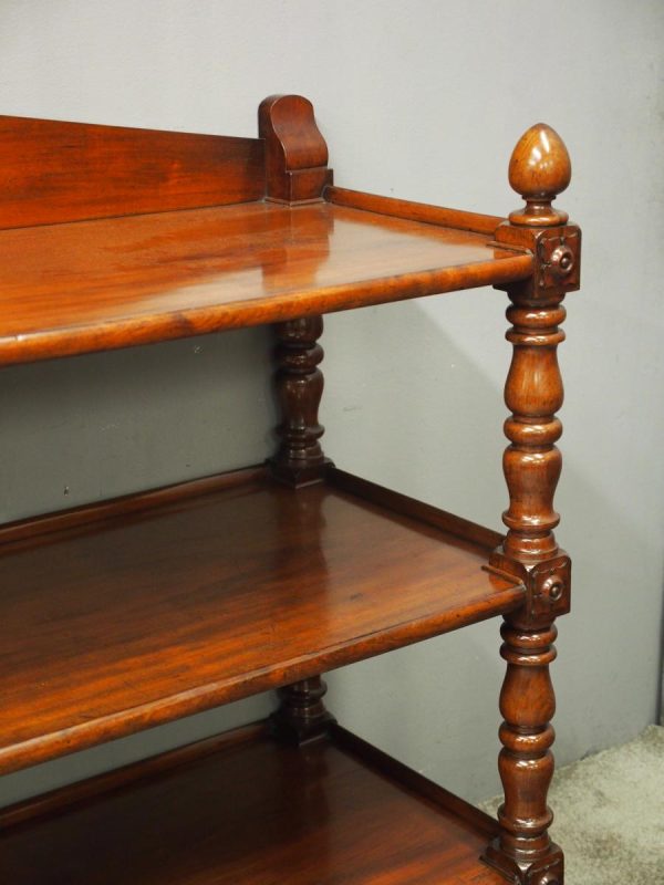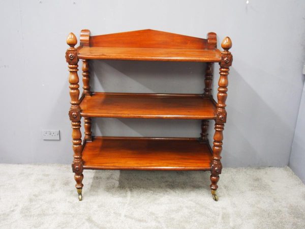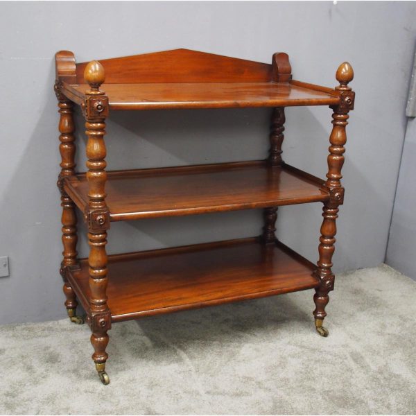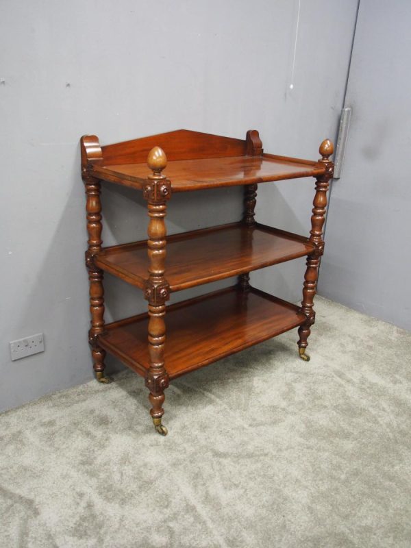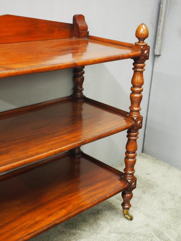 Circa 1830, substantial William IV mahogany buffet or dumb waiter. The three tiers have moulded fronts and are surmounted by a low architectural back and turned finials. These are all secured by bold, turned supports with foliate carved plaques, all over turned feet on brass castors.