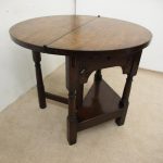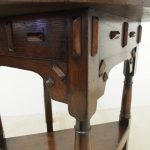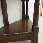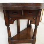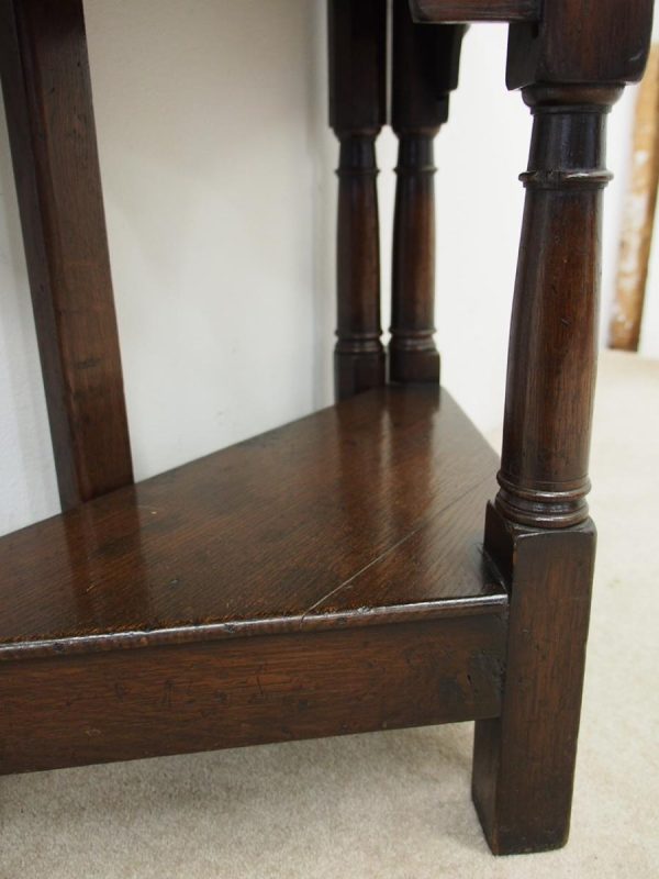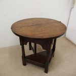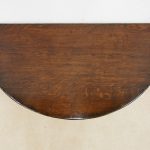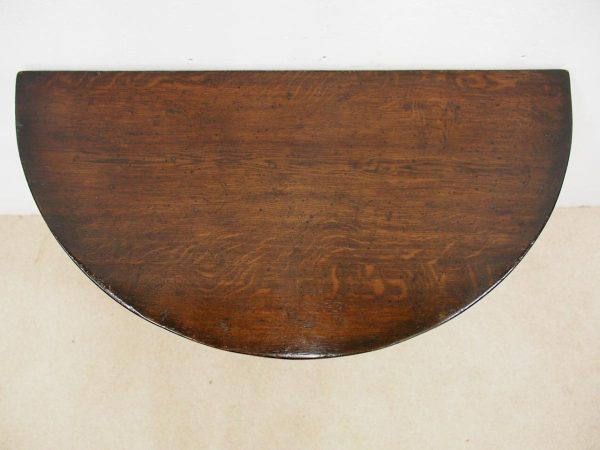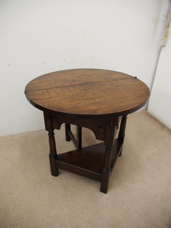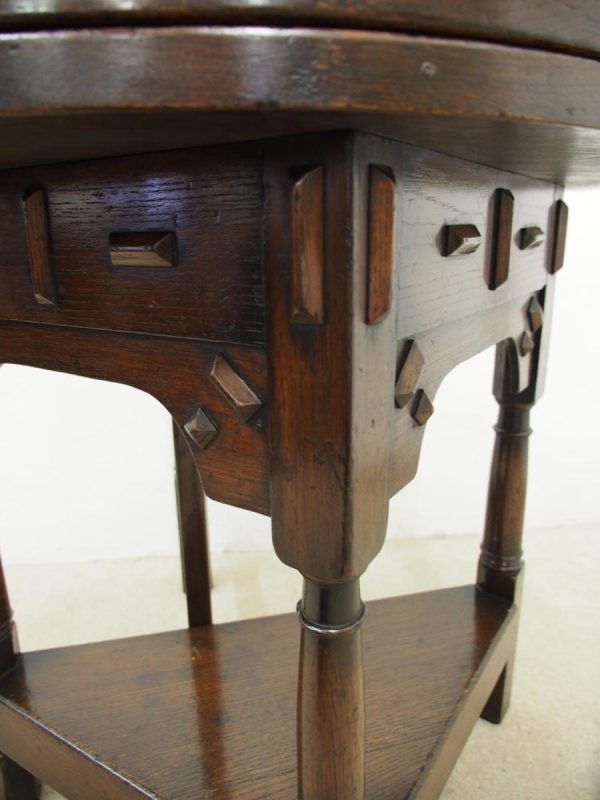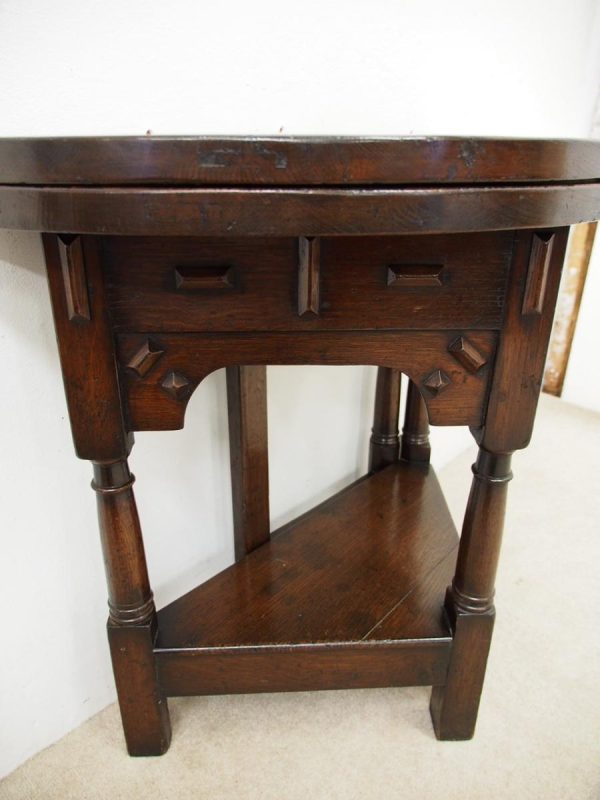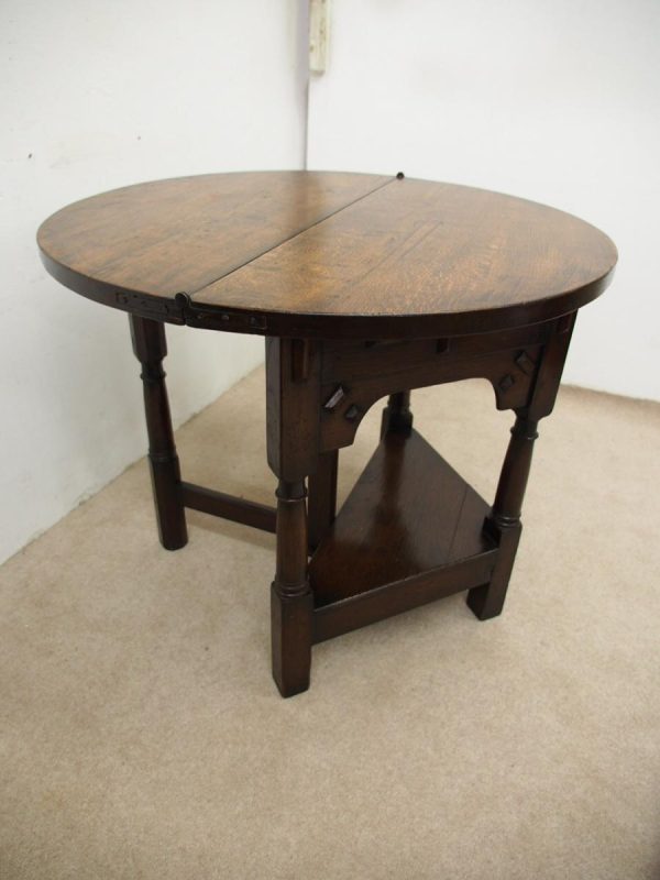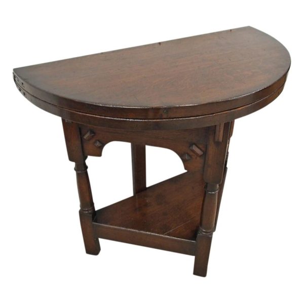 Circa 1880. Jacobean-style fold-over credence table in quarter-cut oak. With a 3cm thick demilune fold-over top and gate leg to rear, a triangular-shaped frieze with applied Jacobean-style geometric mouldings, all on square supports with turnings and a lower gallery.
