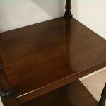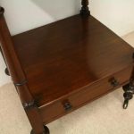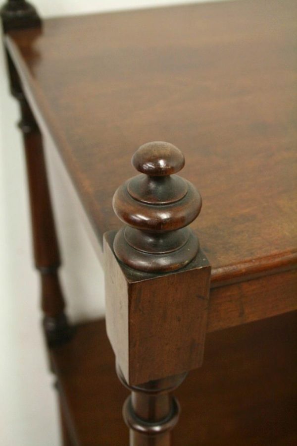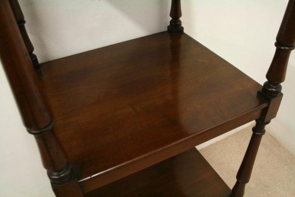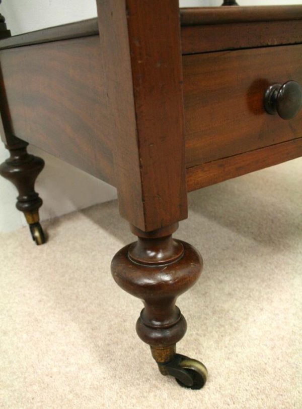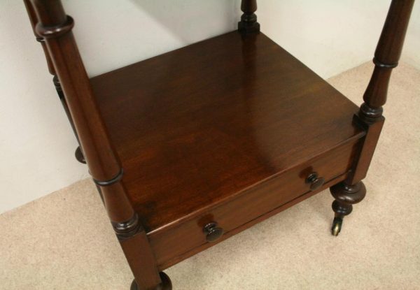 Circa 1830, fine quality original William IV whatnot with 3 tiers topped with stylish turned finials in each corner, a mahogany apron under the top two shelves and a base drawer, standing on turned feet with castors. Good colour and patination.