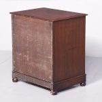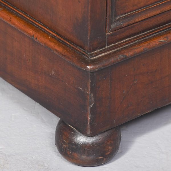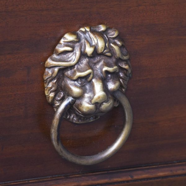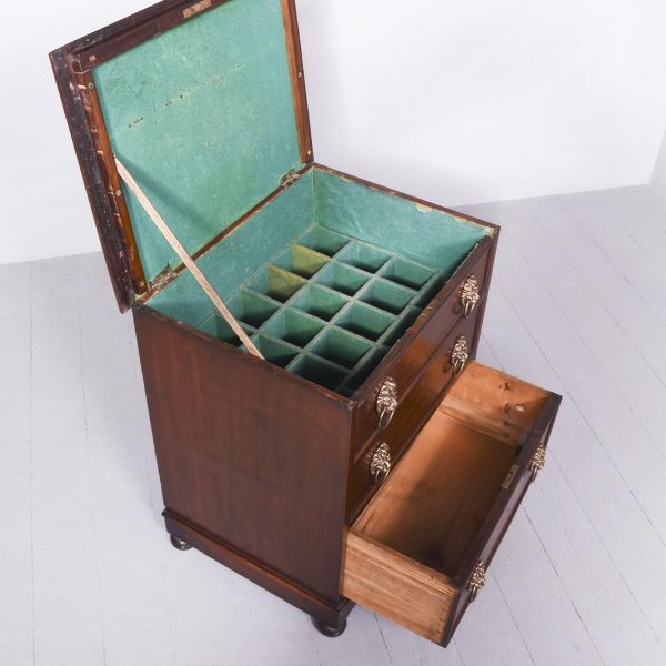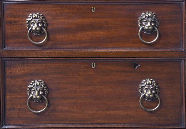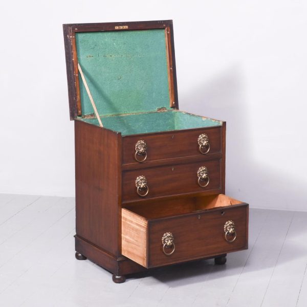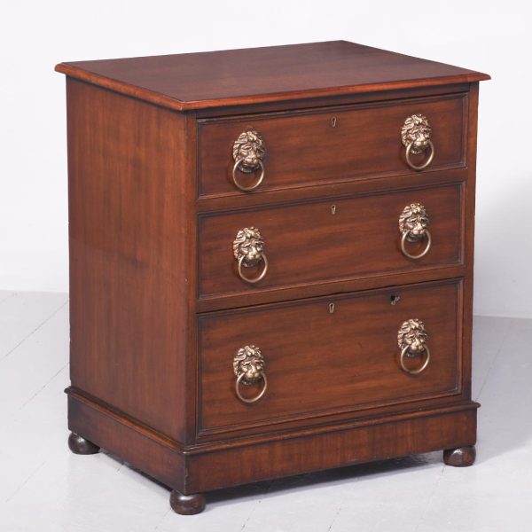 Circa 1830 William IV neat-sized mahogany cellarette in the form of a Georgian chest of drawers. The rectangular polished top in figured Spanish mahogany with moulded edges lifts to reveal the wine containers fronted by two faux drawers with cast brass lion-mask handles, above a matching real drawer. All supported on an enclosed plinth base over neat bun feet.