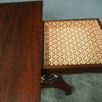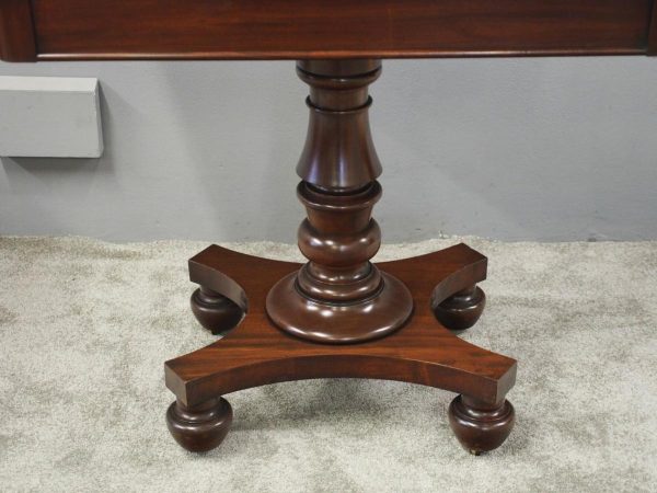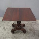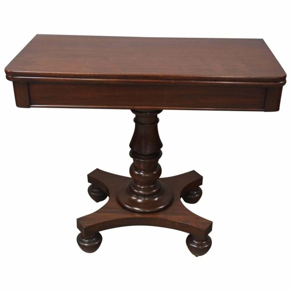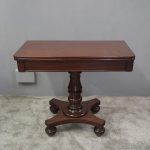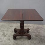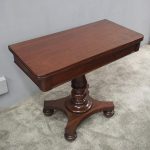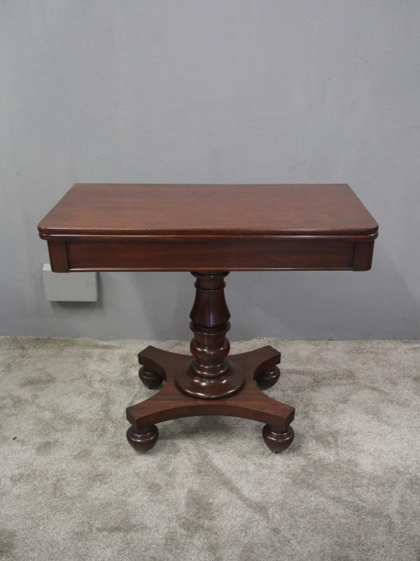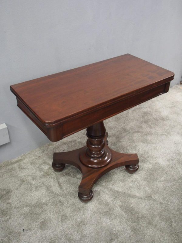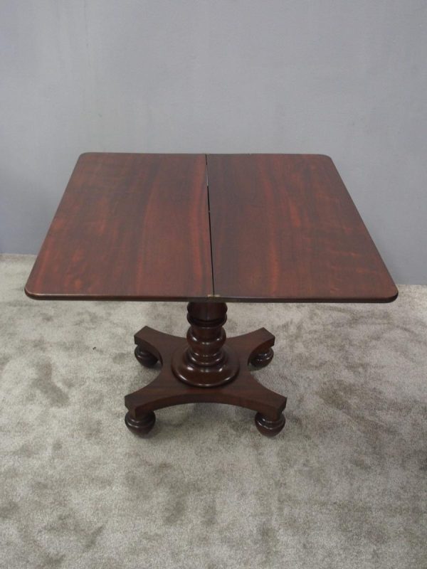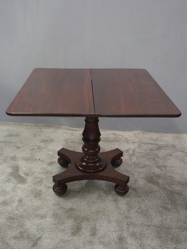 Circa 1835, William IV plum pudding mahogany fold-over tea table. The solid top with rounded corners to the front, which swivels to reveal a small storage space beneath. It has a deep frieze with beading to the base, with it all on a substantial turned and ring turned stem. This has a large circular collar above the concave platform base, all finishing on large tapering bun feet with original castors.