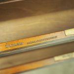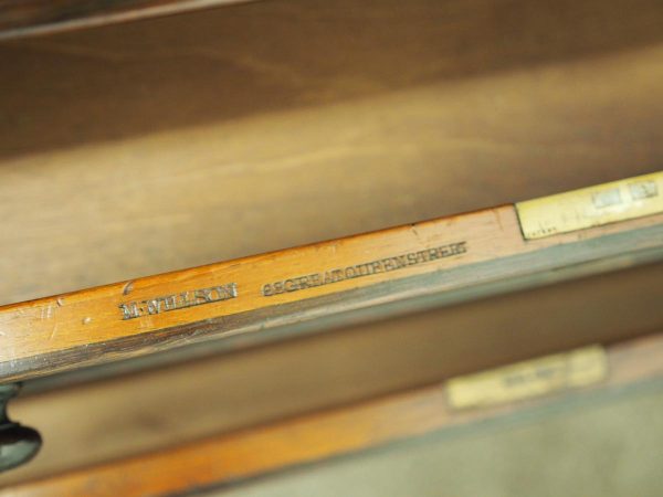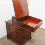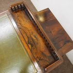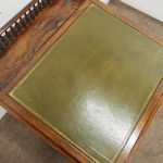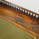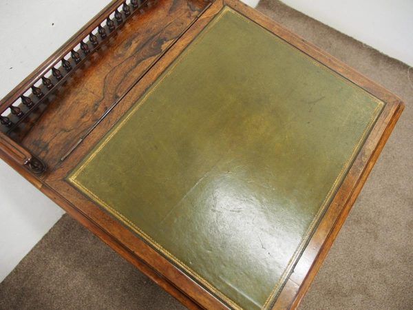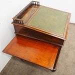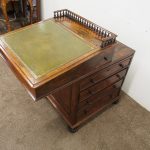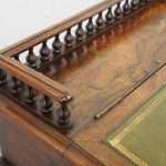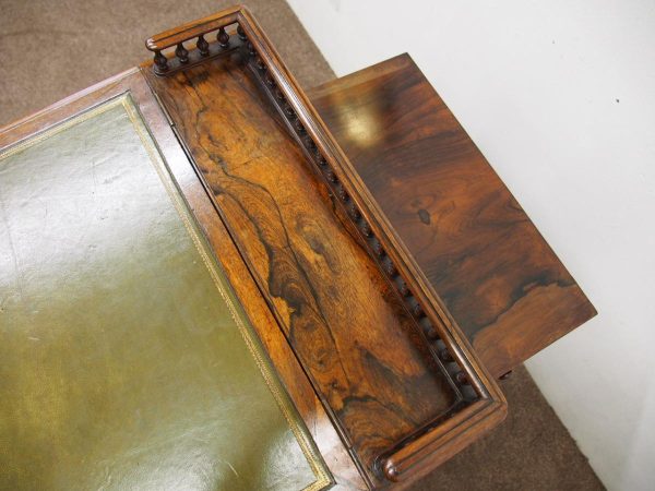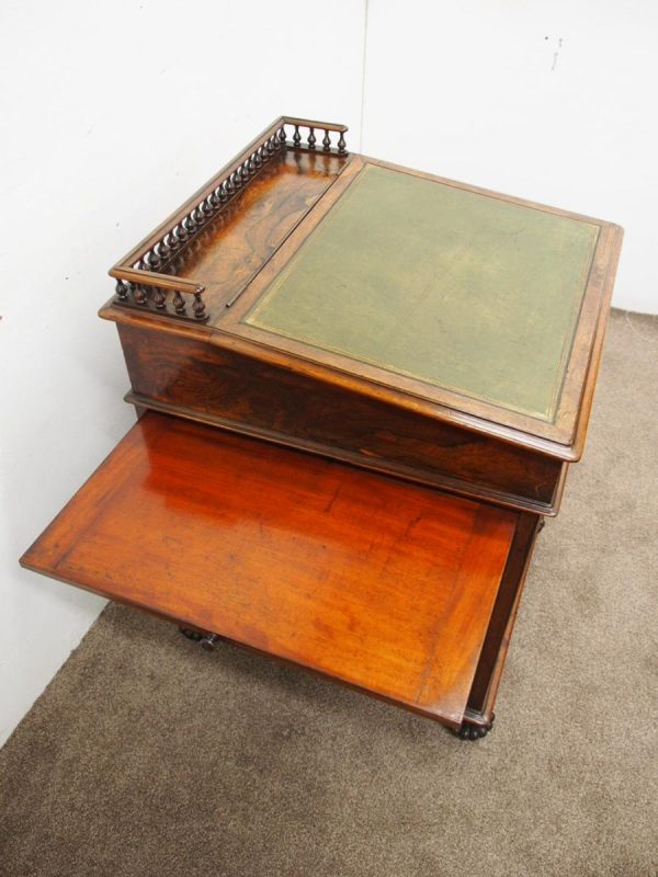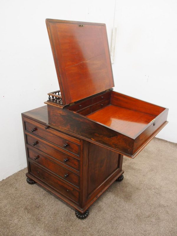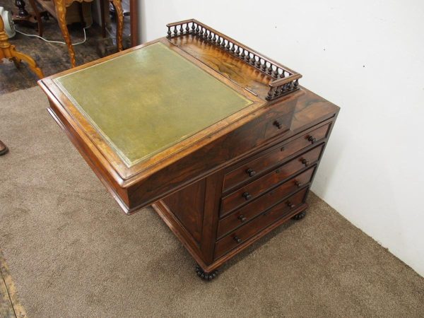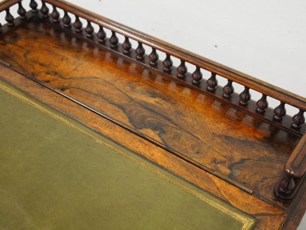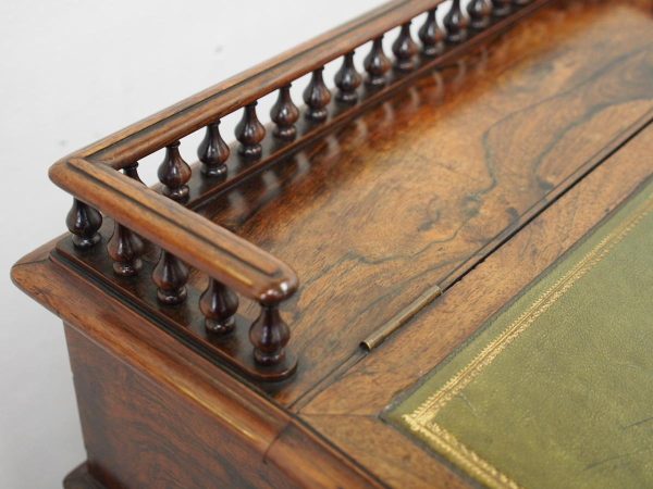 Circa 1830, William IV rosewood davenport with stamp of M. Willson. With a three quarter rosewood gallery with turned balustrades and a beaded top rail. The green leather slope has tooling and gilding and opens to show a mahogany polished interior with 4 drawers, 2 of which are dummy, each with tiny turned knob handles. The front and back of the davenport have fielded panels with a rosewood section inside and the desk is polished on all sides. On the left, is a full length pull out slide for storage and 4 dummy drawers. There is a stamp to the top drawer of M. Willson, 68 Great Queen Street. This was likely of Mary and Matthew Willson, the wife and son of Thomas Willson who was a furniture broker and appraiser at 68 Great Queen Street, London. The ogee moulding runs around the desk and it stands on elegant squat, turned and fluted legs with brass castors beneath.