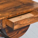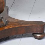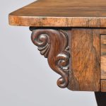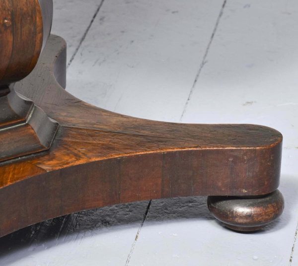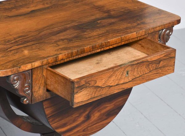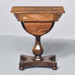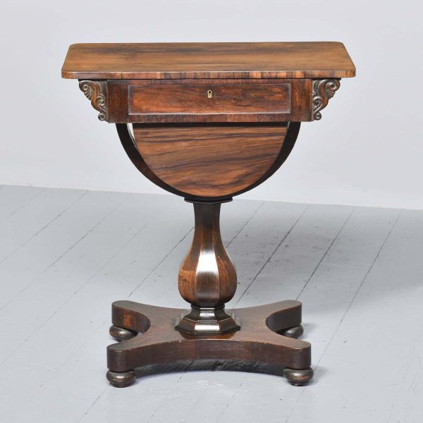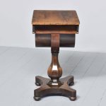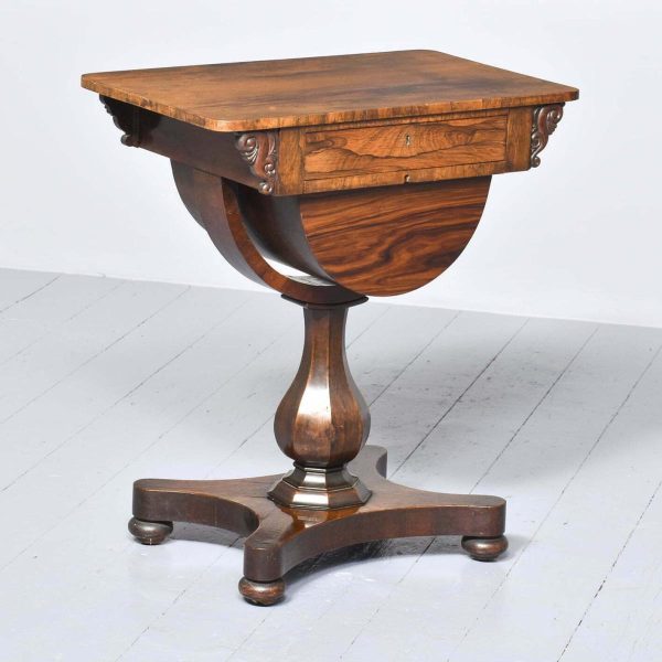 Circa 1840. William IV rosewood Victorian work box. The rectangular top with rounded edges in beautifully Brazilian rosewood above a frieze drawer with working lock and cedar lined drawer and a shaped sliding basket in figured rosewood. All supported on a shaped octagonal column over a quadripartite platform base with neat bun feet with hidden brass casters.