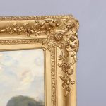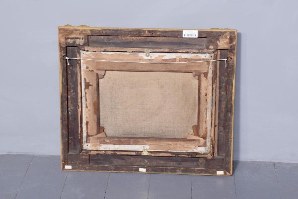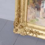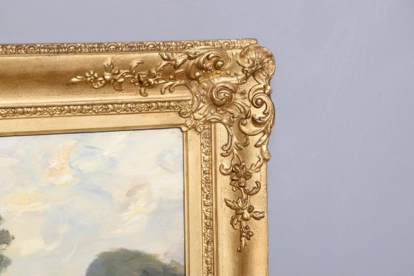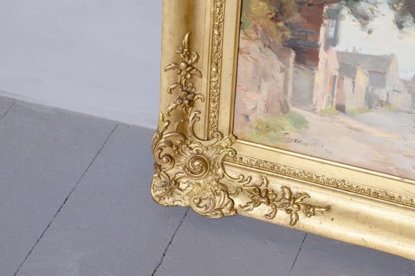 A dated oil painting by ‘William Millar Fraser’ dated 1913, oil painting depicts ‘Blakely in Norfolk’, with village scene beside the river with cottages, houses and person on a horse and people walking, in a classic carved and gilded frame, with the remnants of the original trade labels on the back