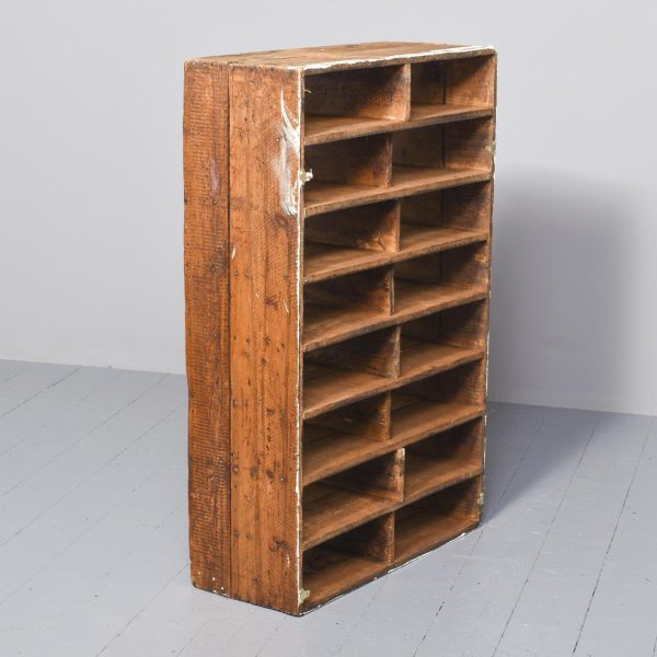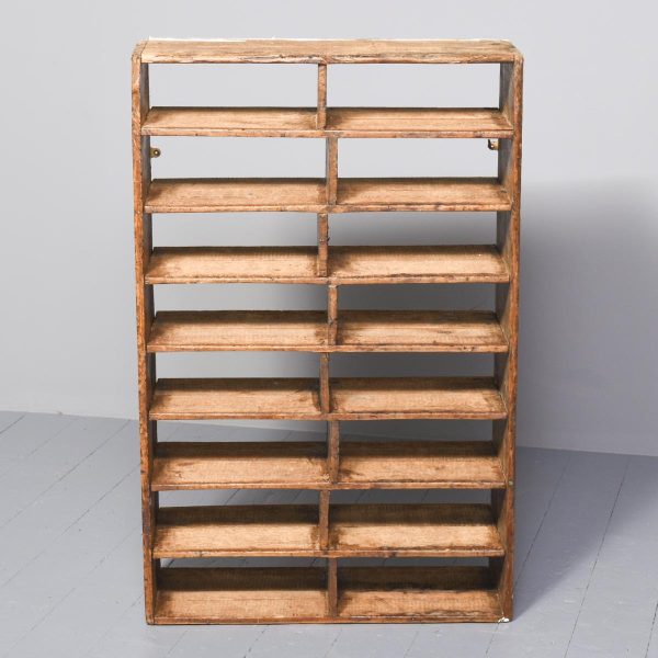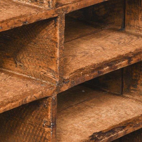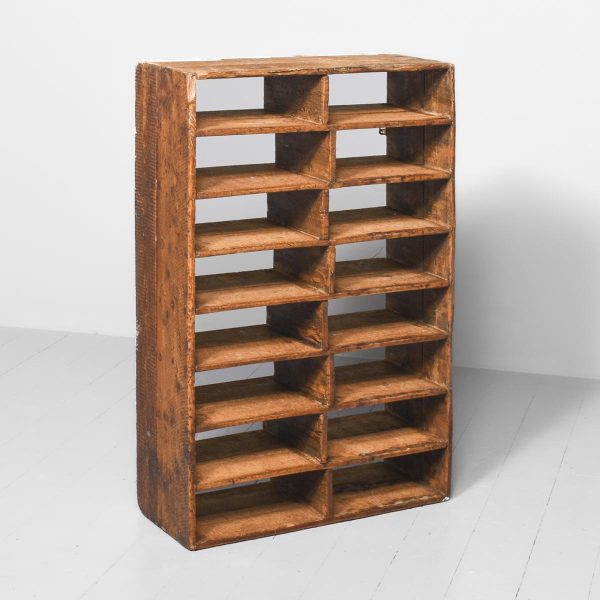 Circa 1930s. An unusual set of wall shelves with sixteen divisions finished with a very rustic look. Can be hung horizontal or portrait, and could be used for storing wine.